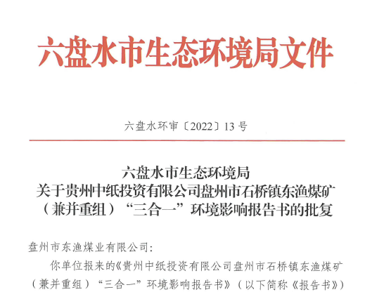 貴州中紙投資有限公司盤州市石橋鎮東漁煤礦(兼并重組)“三合一”環境影響報告