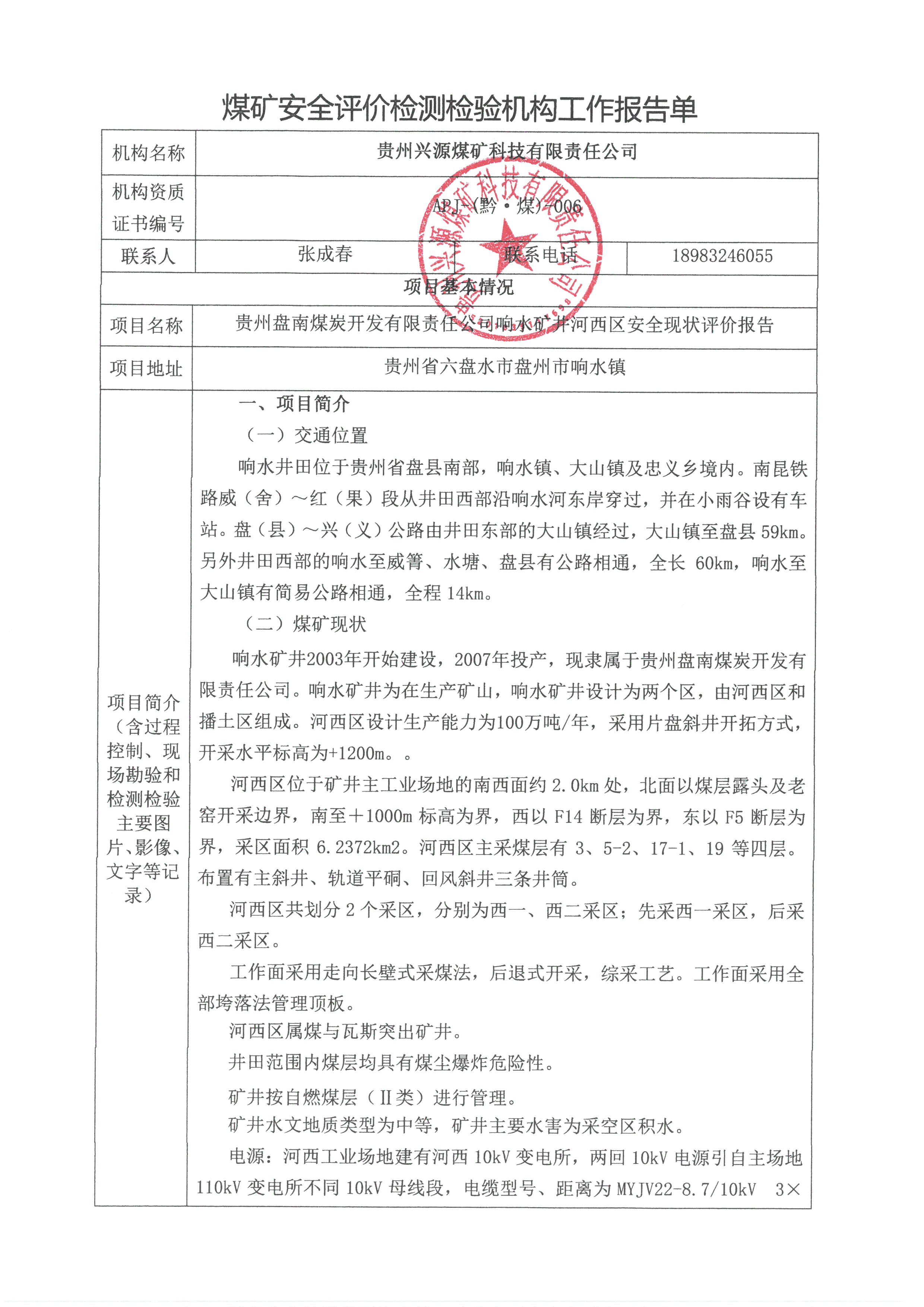 煤礦安全評價檢測檢驗機構工作報告單【貴州盤南煤炭開發有限責任公司響水礦井河西區安全現狀評價報告】