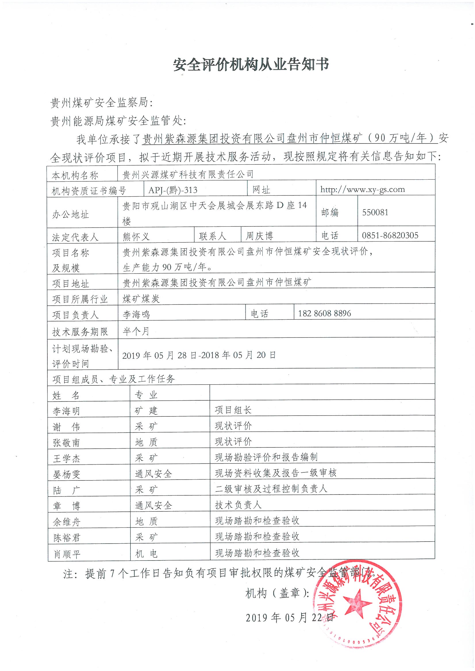 安全評價機構從業告知書【貴州紫森源集團投資有限公司盤州市仲恒煤礦】