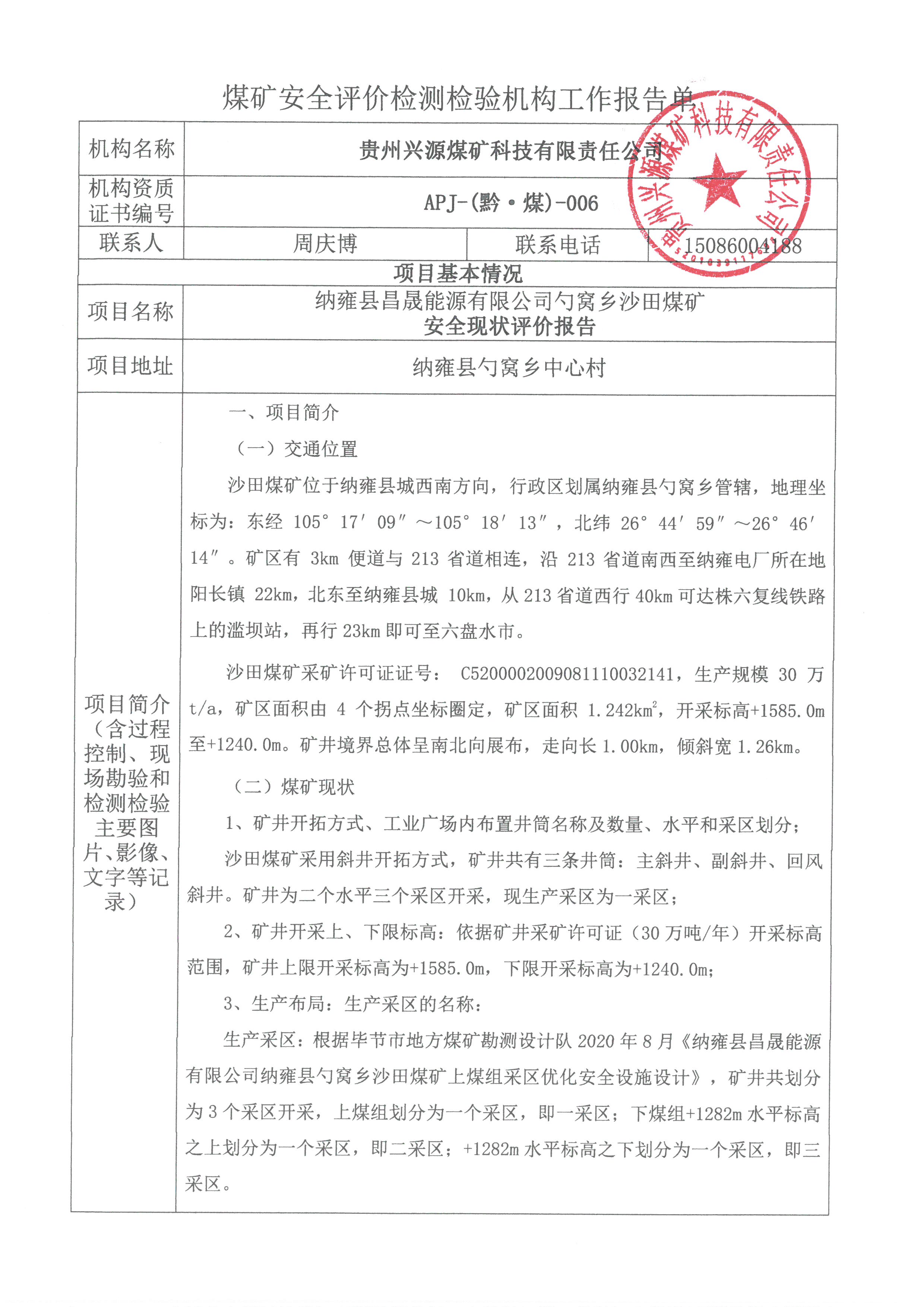 安全評價檢驗檢測機構工作報告單【納雍縣勺窩鄉沙田煤礦安全現狀評價項目】
