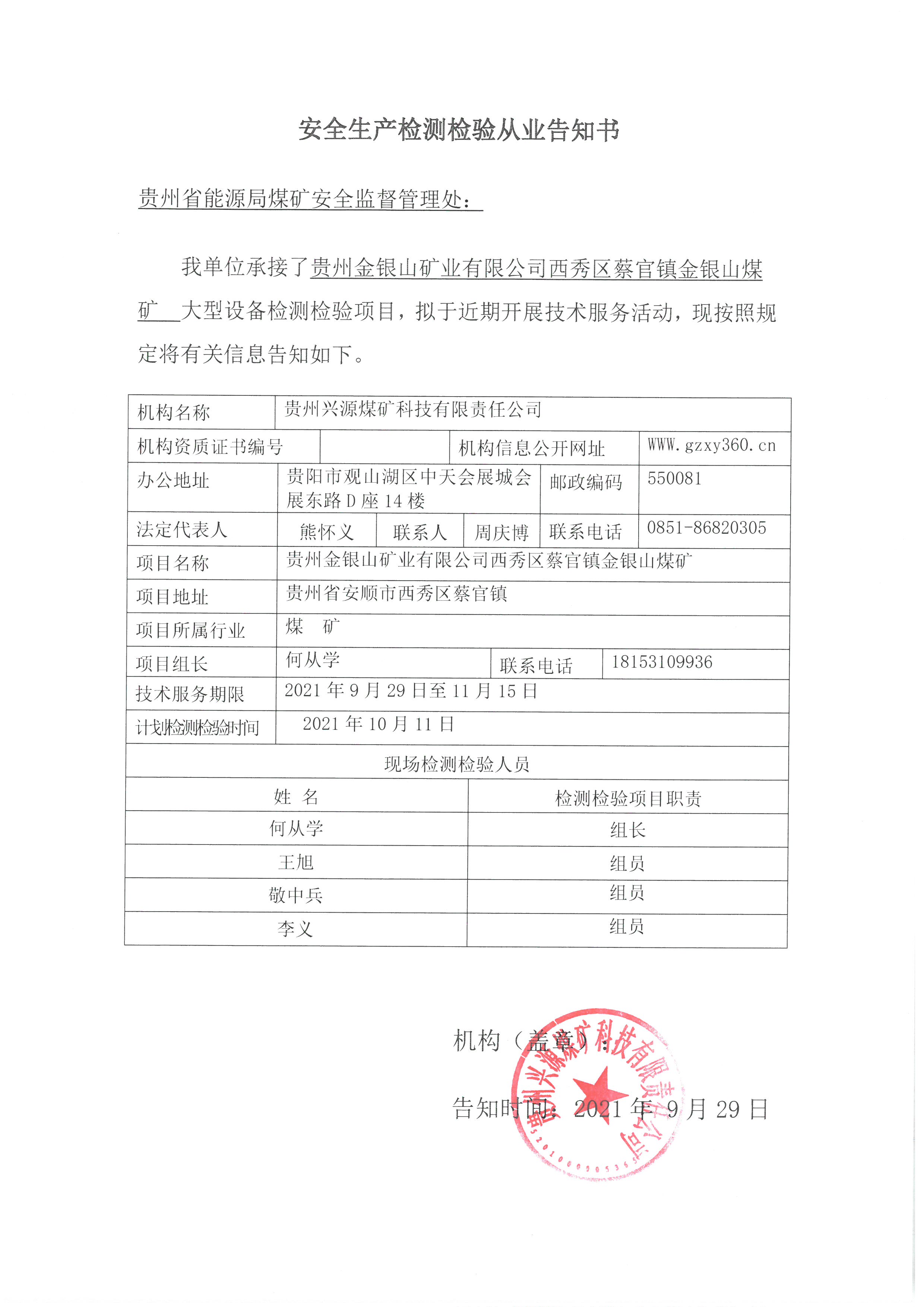 安全生產檢測檢驗從業告知書【貴州金銀山礦業有限公司西秀區蔡官鎮金銀山煤礦】