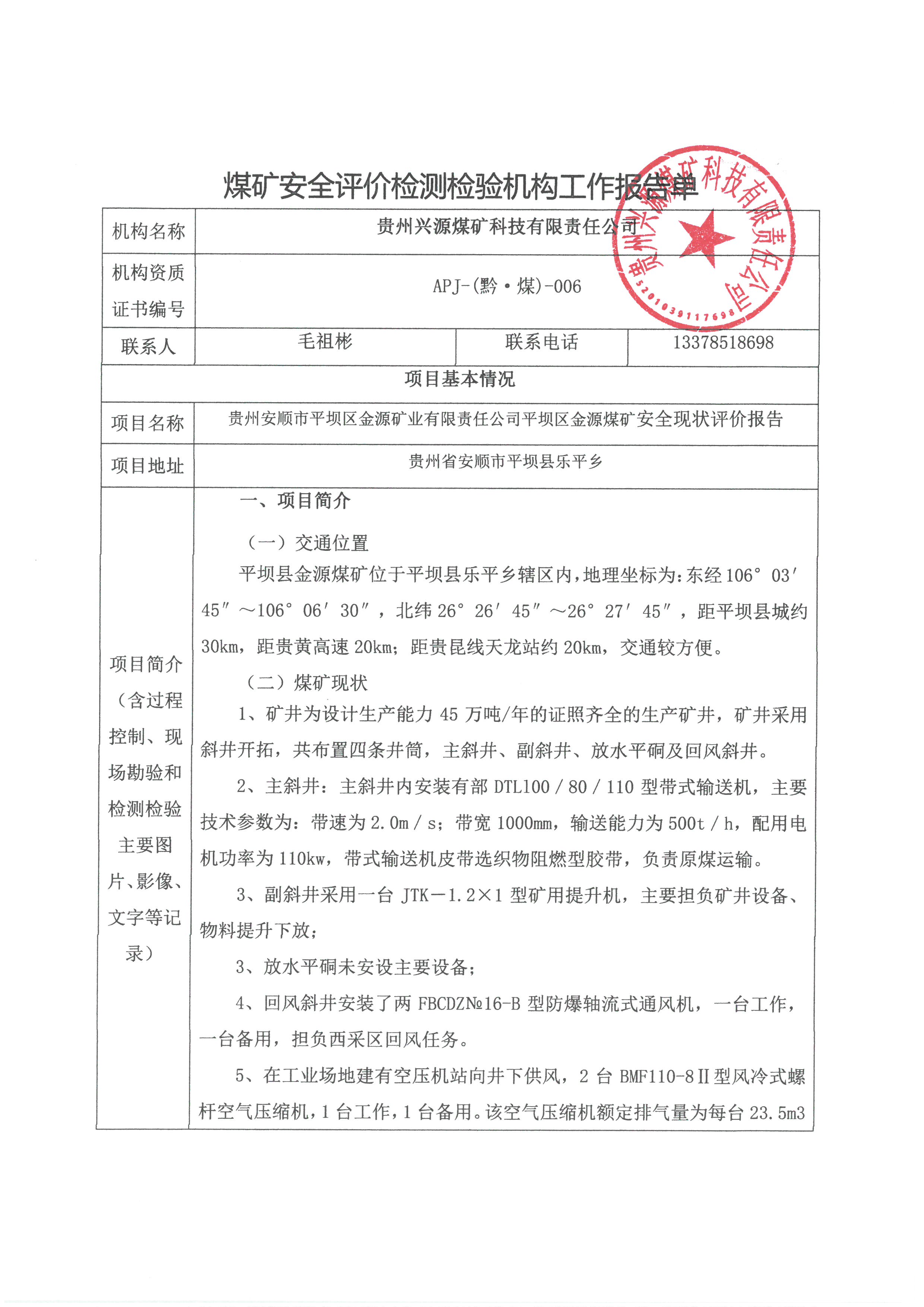 煤礦安全評價檢測檢驗機構工作報告單【貴州安順市平壩區金源礦業有限責任公司平壩區金源煤礦安全現狀評價報告】