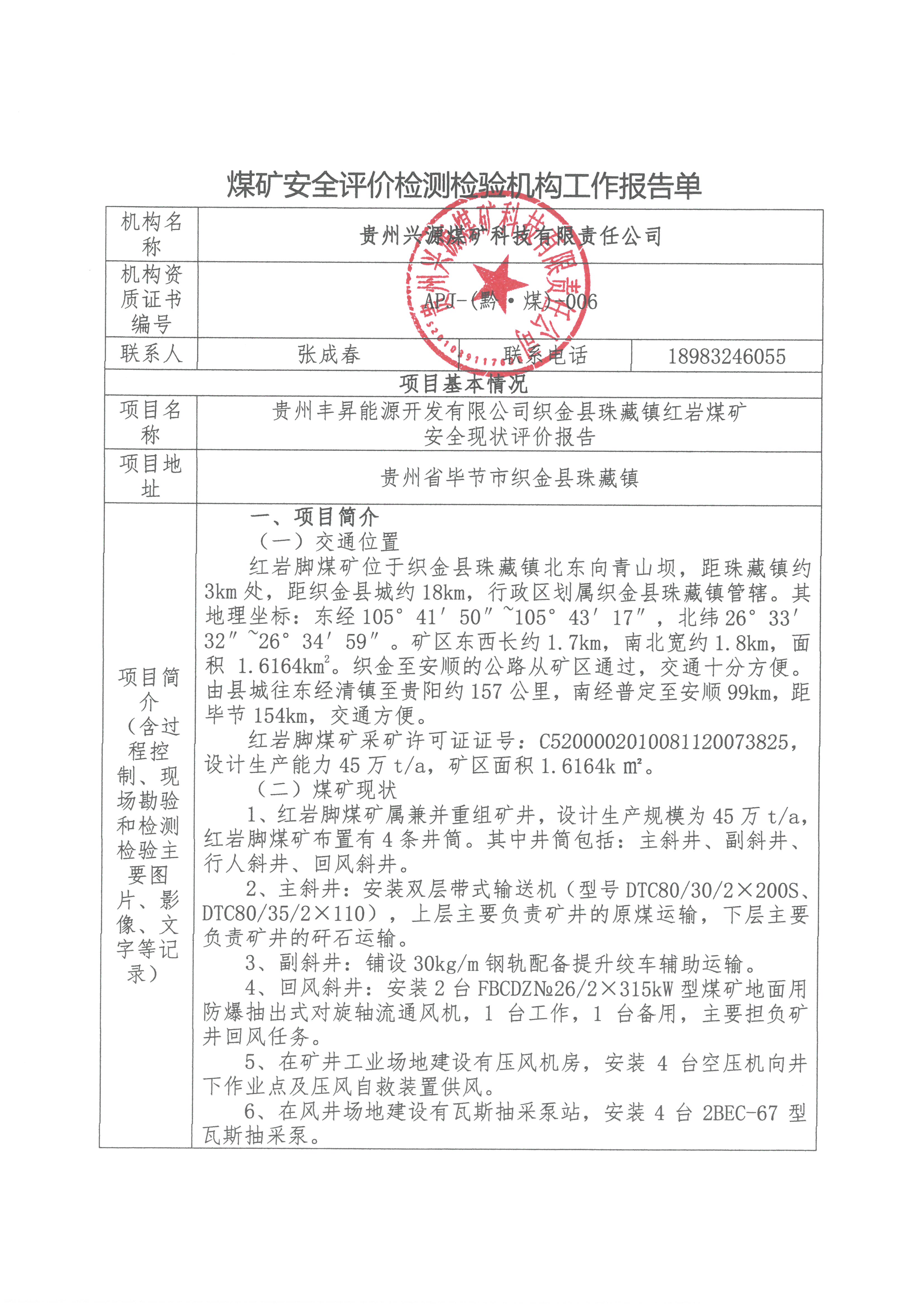 煤礦安全評(píng)價(jià)檢測(cè)檢驗(yàn)機(jī)構(gòu)工作報(bào)告單【貴州豐昇能源開發(fā)有限公司織金縣珠藏鎮(zhèn)紅巖煤礦安全現(xiàn)狀評(píng)價(jià)報(bào)告】