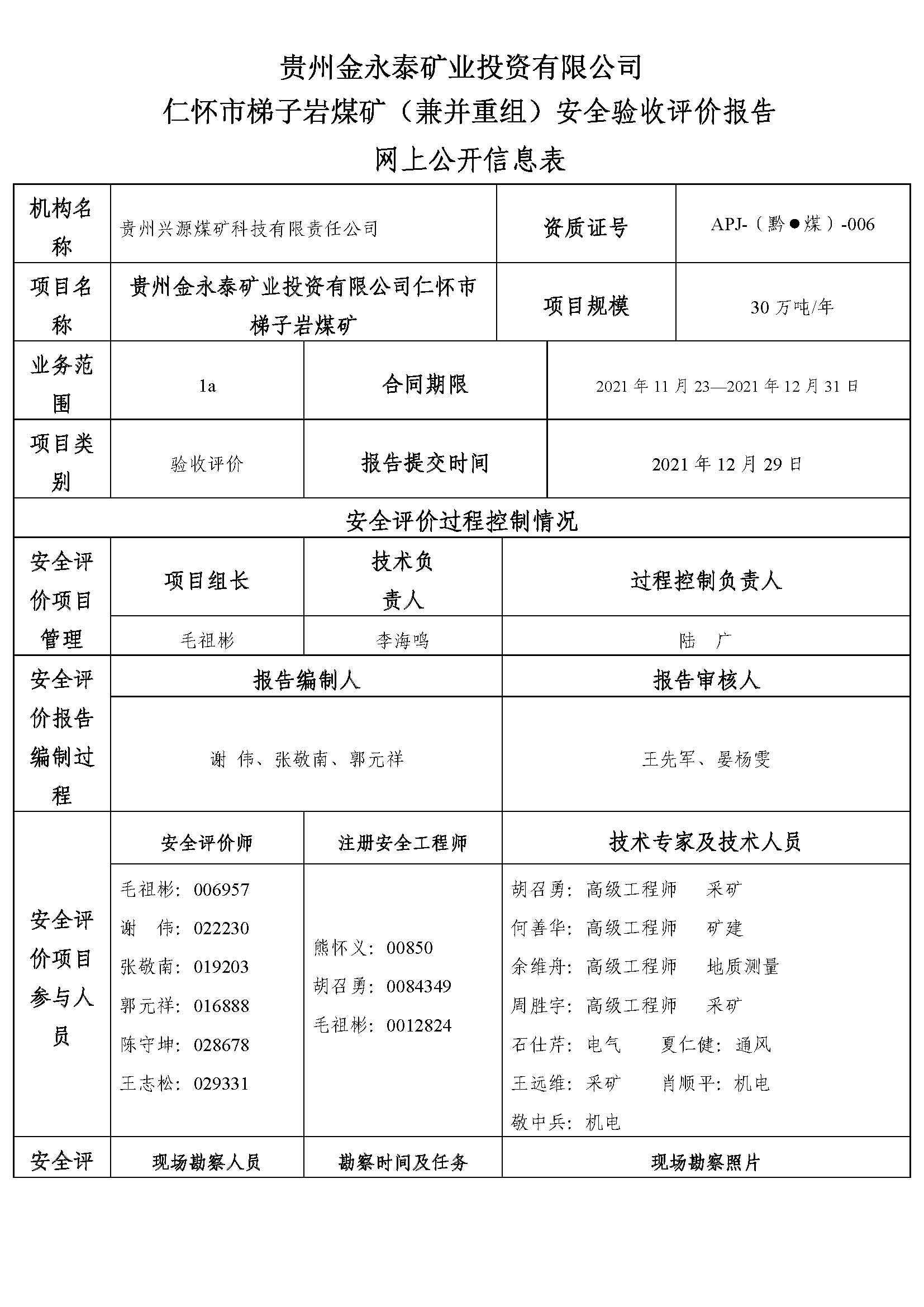 貴州金永泰礦業(yè)投資有限公司仁懷市梯子巖煤礦(兼并重組)安全驗(yàn)收評(píng)價(jià)報(bào)告網(wǎng)上公開(kāi)信息表
