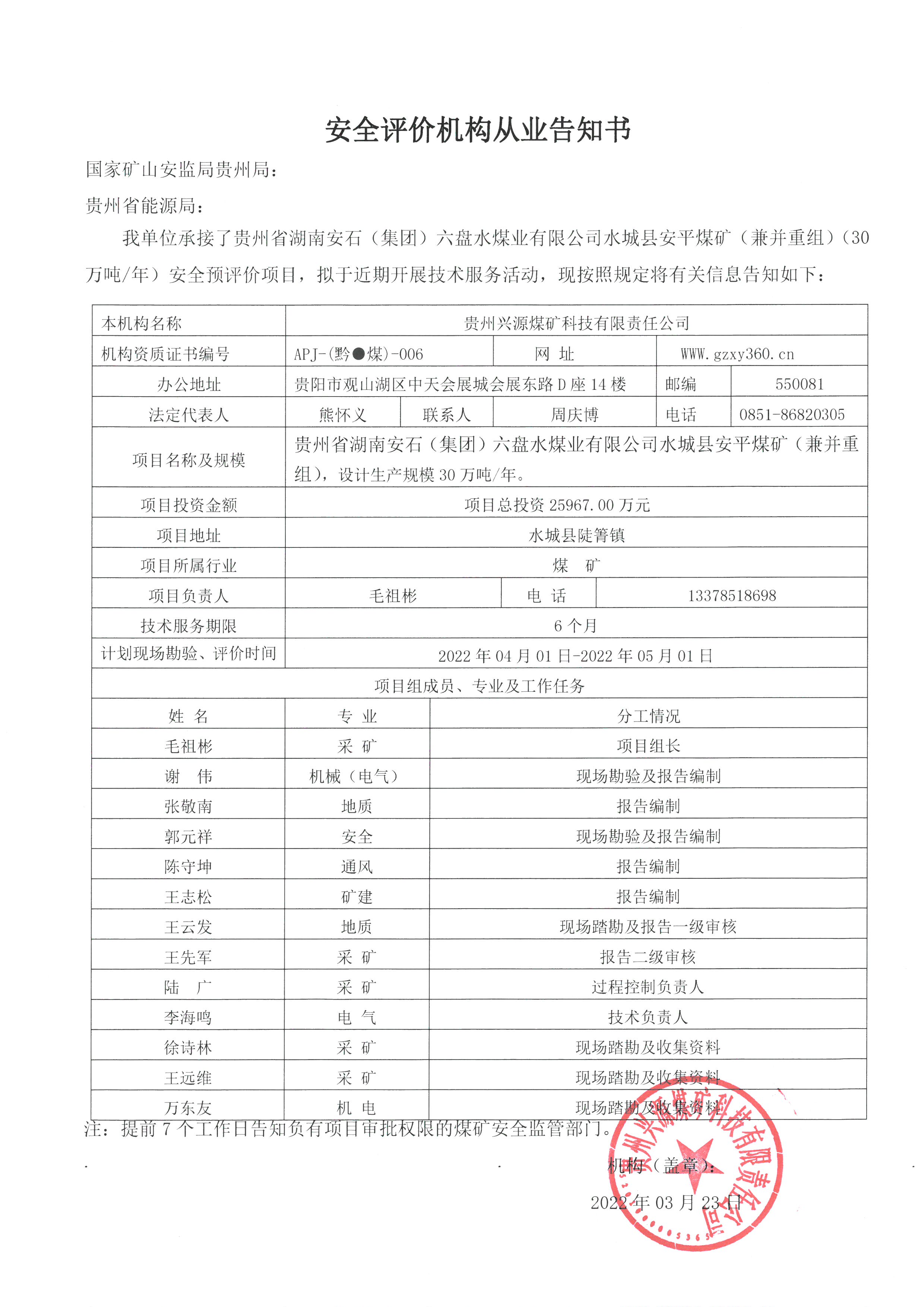 安全評(píng)價(jià)機(jī)構(gòu)從業(yè)告知書(shū)【貴州省湖南安石(集團(tuán))六盤(pán)水煤業(yè)有限公司水城縣安平煤礦(兼并重組)(30萬(wàn)噸/年)安全預(yù)評(píng)價(jià)】