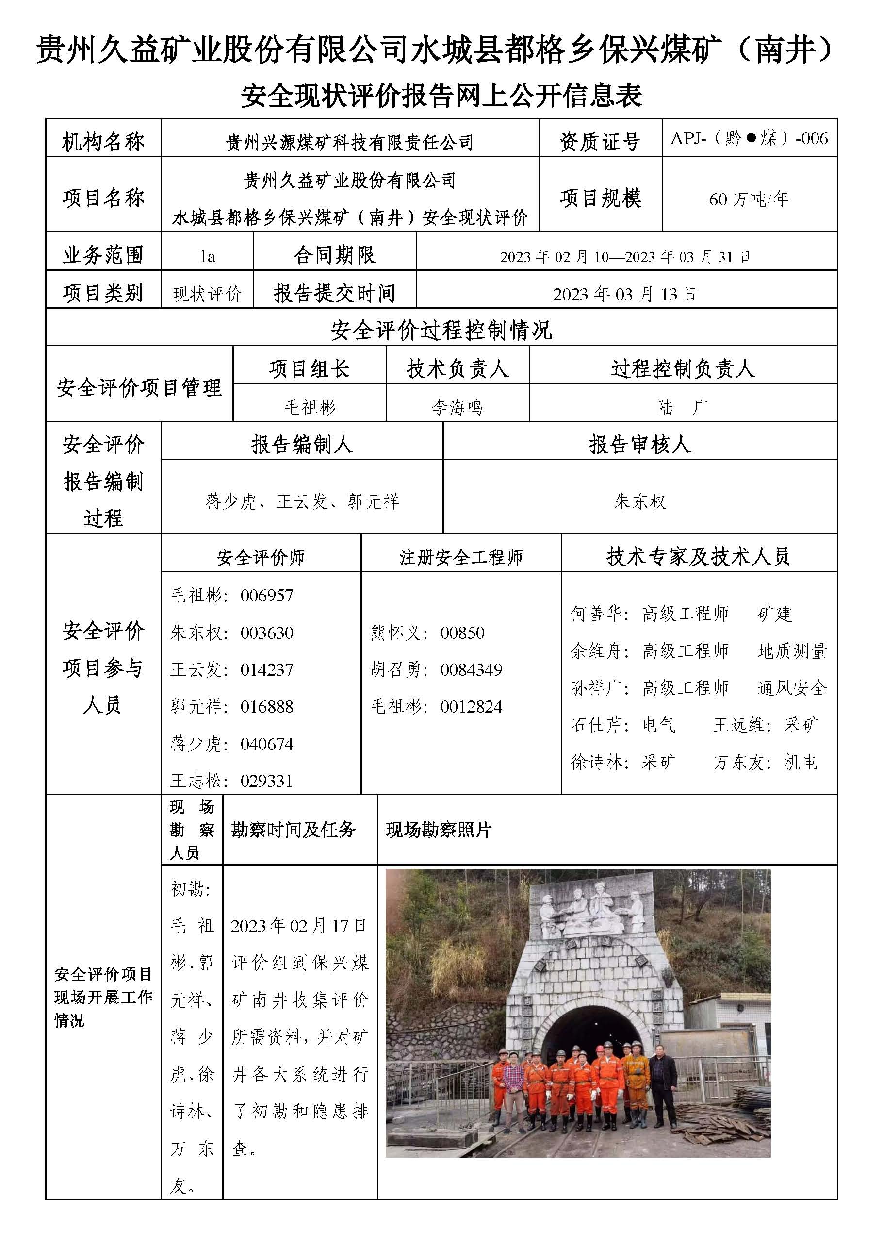 貴州久益礦業(yè)股份有限公司水城縣都格鄉(xiāng)保興煤礦(南井)安全現(xiàn)狀評(píng)價(jià)報(bào)告網(wǎng)上公開(kāi)信息表