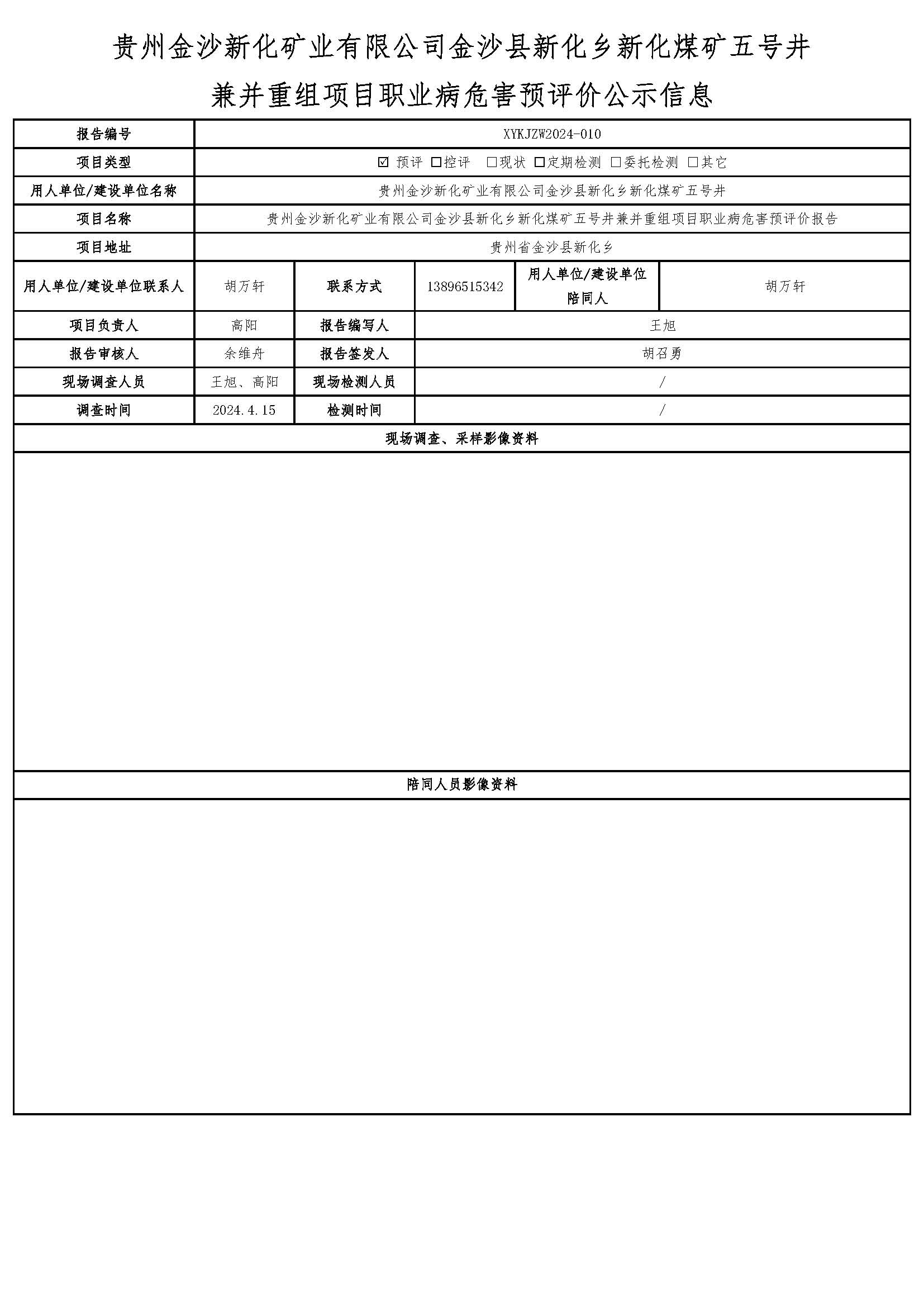 貴州金沙新化礦業有限公司金沙縣新化鄉新化煤礦五號井 兼并重組項目職業病危害預評價公示信息