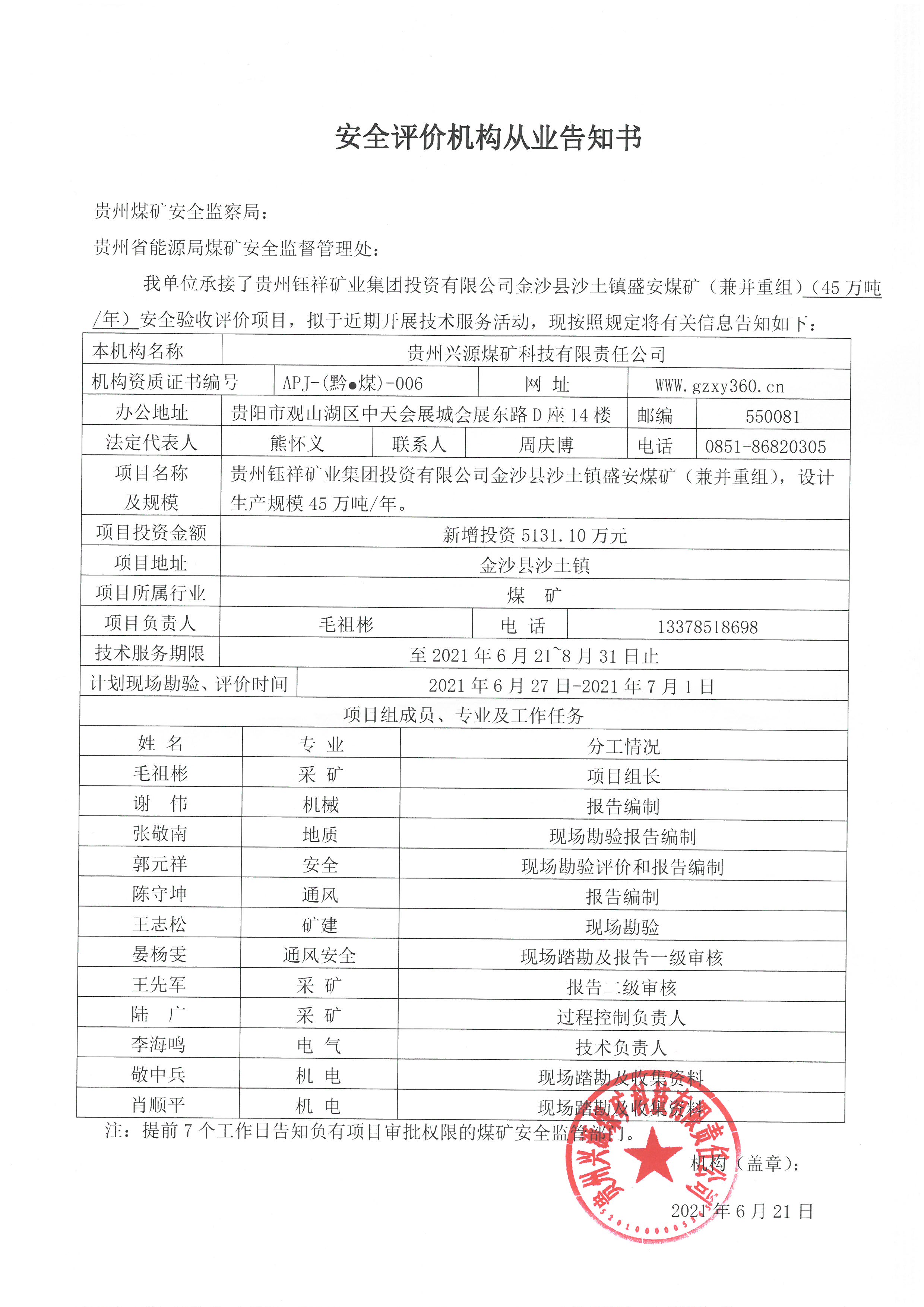 安全評價機構從業告知書(貴州鈺祥礦業集團投資有限公司金沙縣沙土鎮盛安煤礦(兼并重組)(45萬噸年)安全驗收評價)