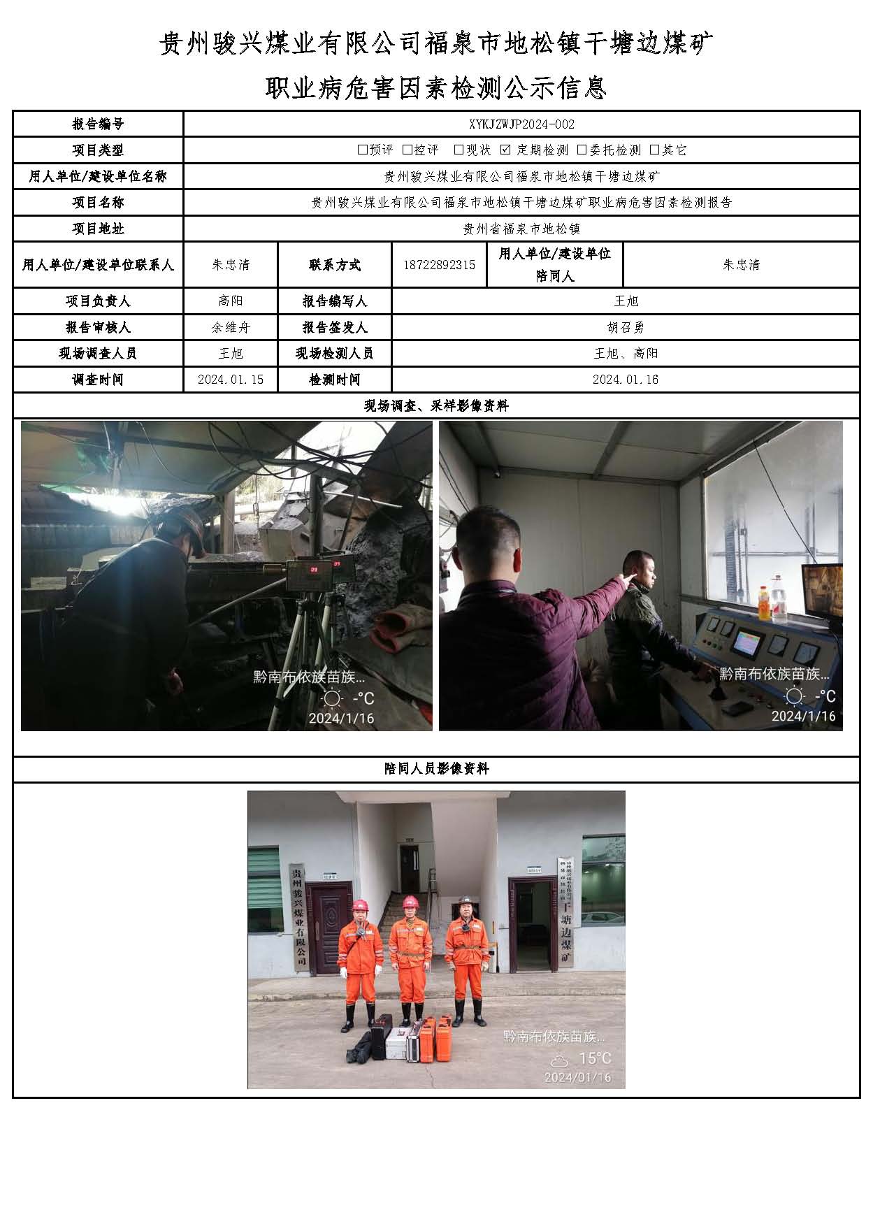 貴州駿興煤業有限公司福泉市地松鎮干塘邊煤礦職業病危害因素檢測公示信息