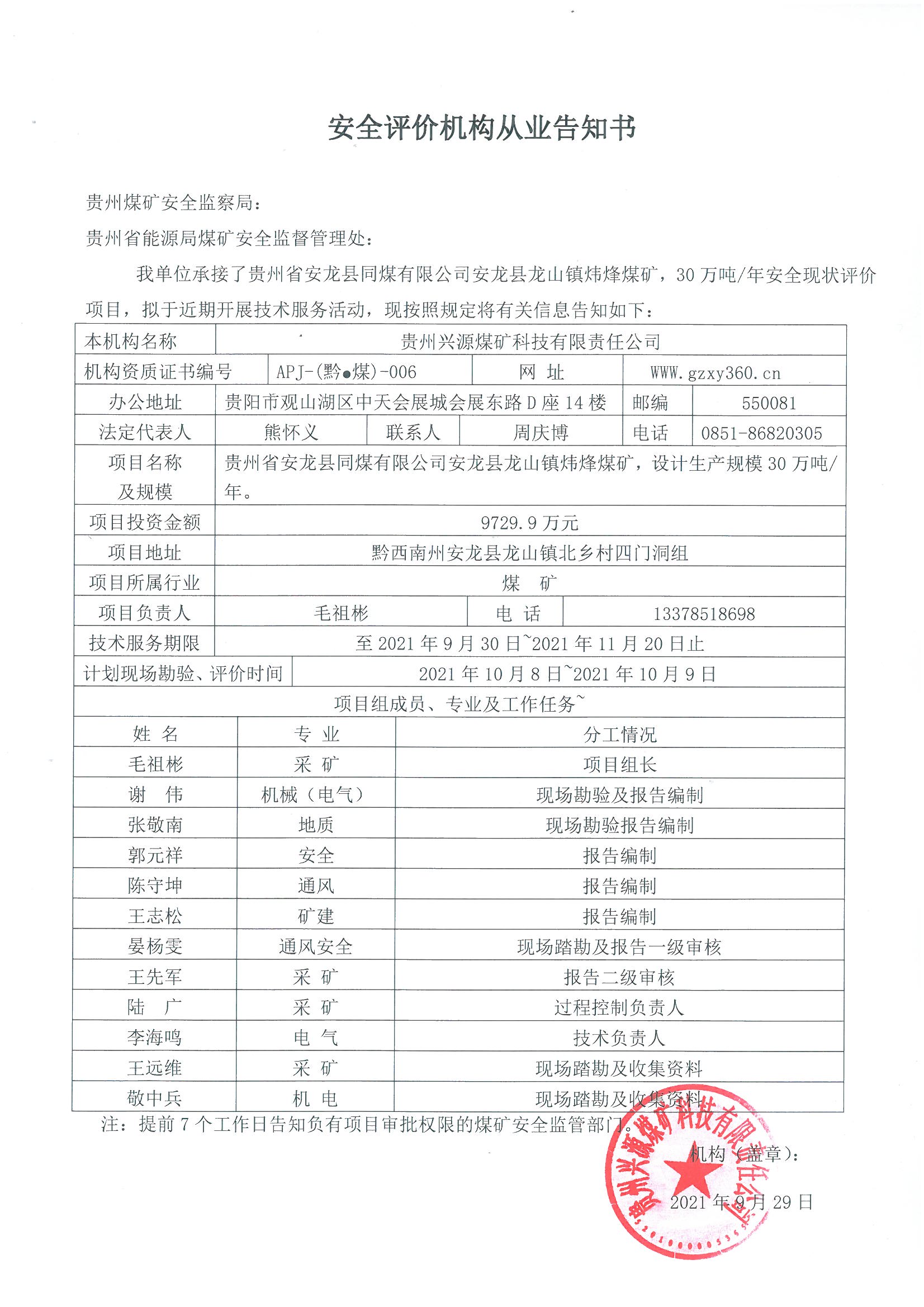 安全評(píng)價(jià)機(jī)構(gòu)從業(yè)告知書(貴州省安龍縣同煤有限公司安龍縣龍山鎮(zhèn)煒?lè)槊旱V)