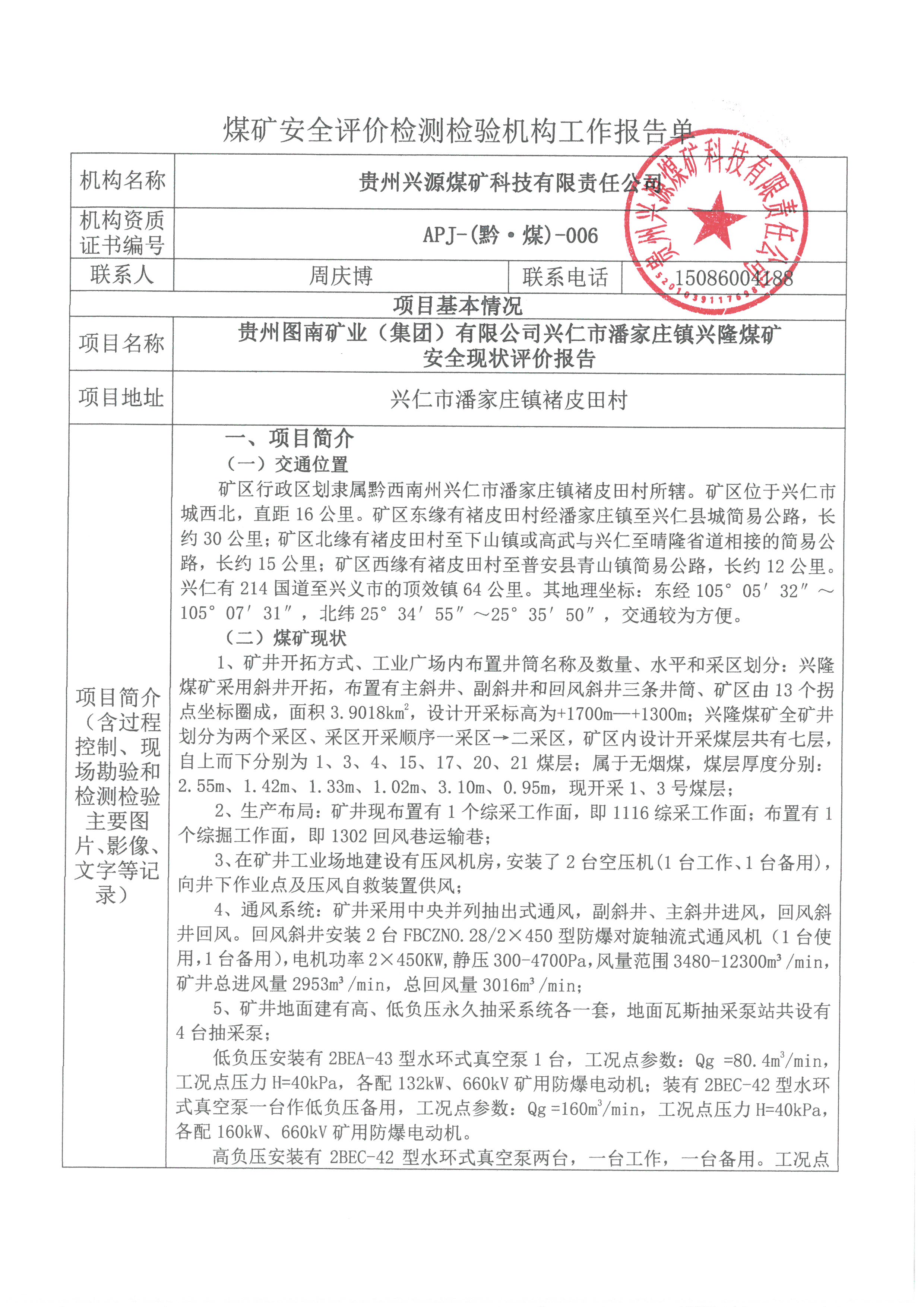 煤礦安全評(píng)價(jià)檢測(cè)檢驗(yàn)機(jī)構(gòu)工作報(bào)告單【貴州圖南礦業(yè)(集團(tuán))有限公司興仁市潘家莊鎮(zhèn)興隆煤礦安全現(xiàn)狀評(píng)價(jià)報(bào)告】