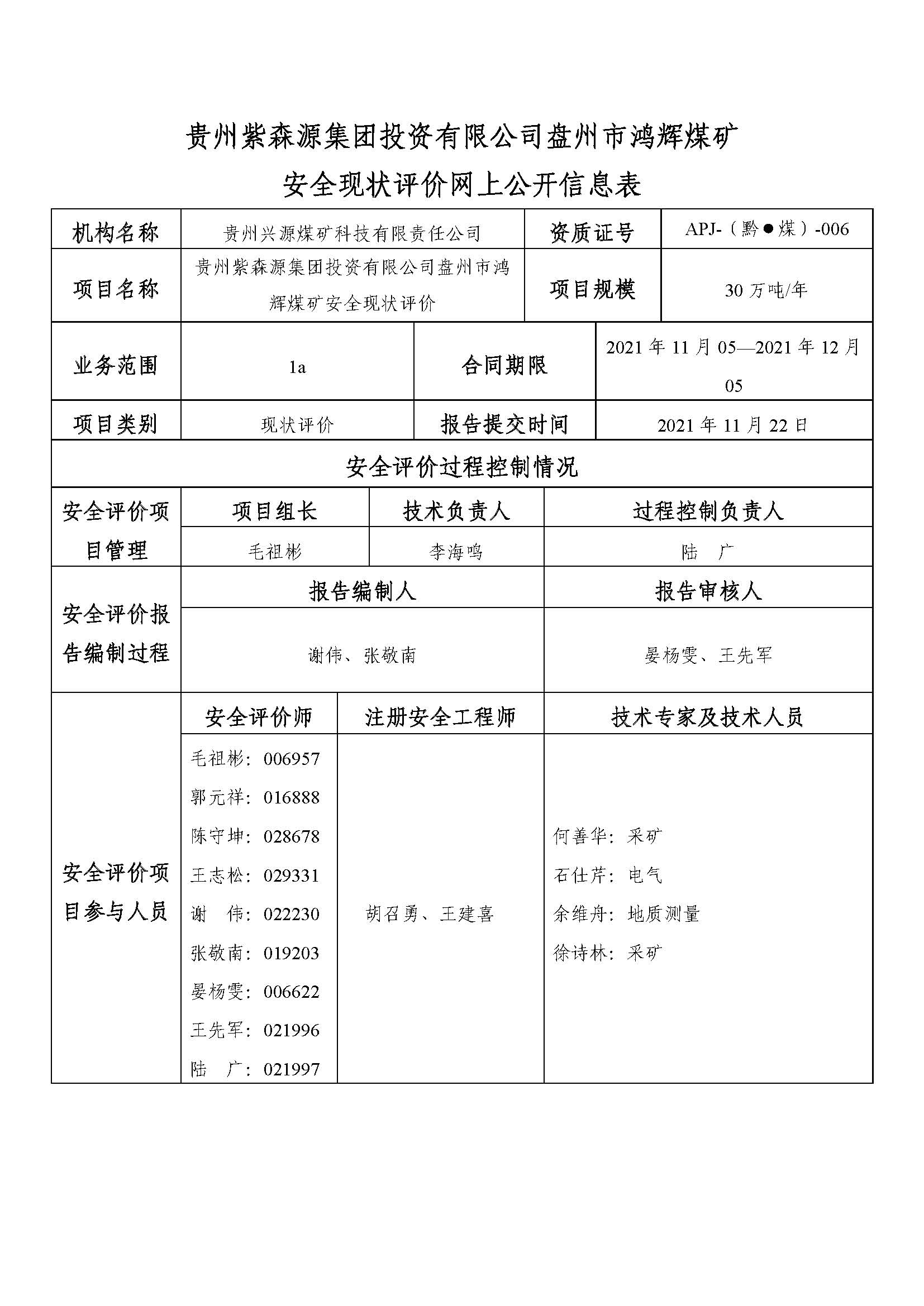 貴州紫森源集團投資有限公司盤州市鴻輝煤礦 安全現狀評價網上公開信息表