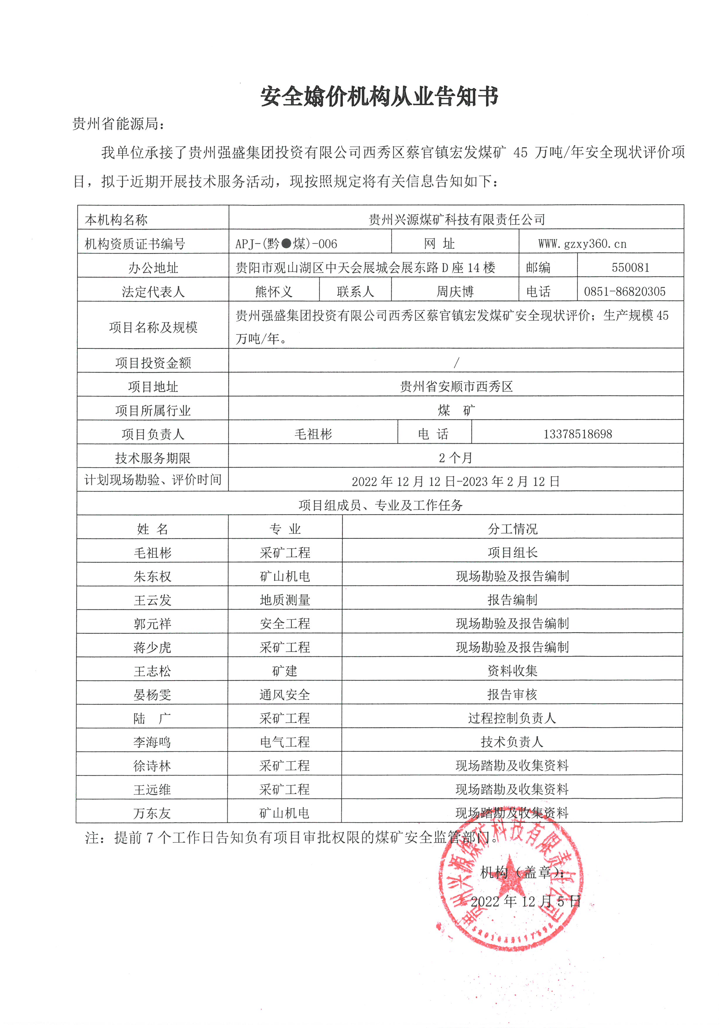 煤礦安全評(píng)價(jià)機(jī)構(gòu)從業(yè)告知書【貴州強(qiáng)盛集團(tuán)投資有限公司西秀區(qū)蔡官鎮(zhèn)宏發(fā)煤礦】