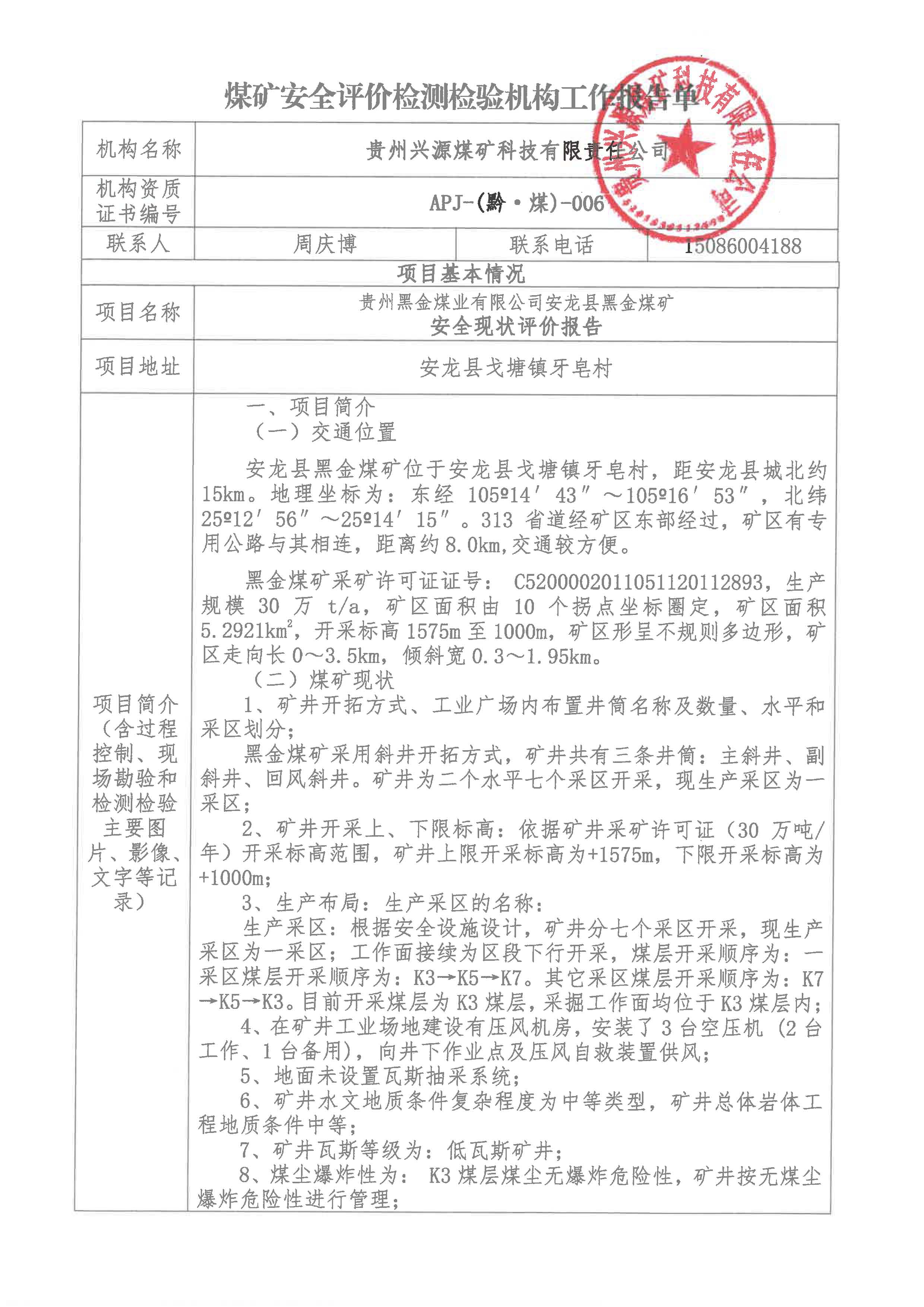 煤礦安全評價檢測檢驗機構工作報告單【貴州黑金煤業有限公司安龍縣黑金煤礦】