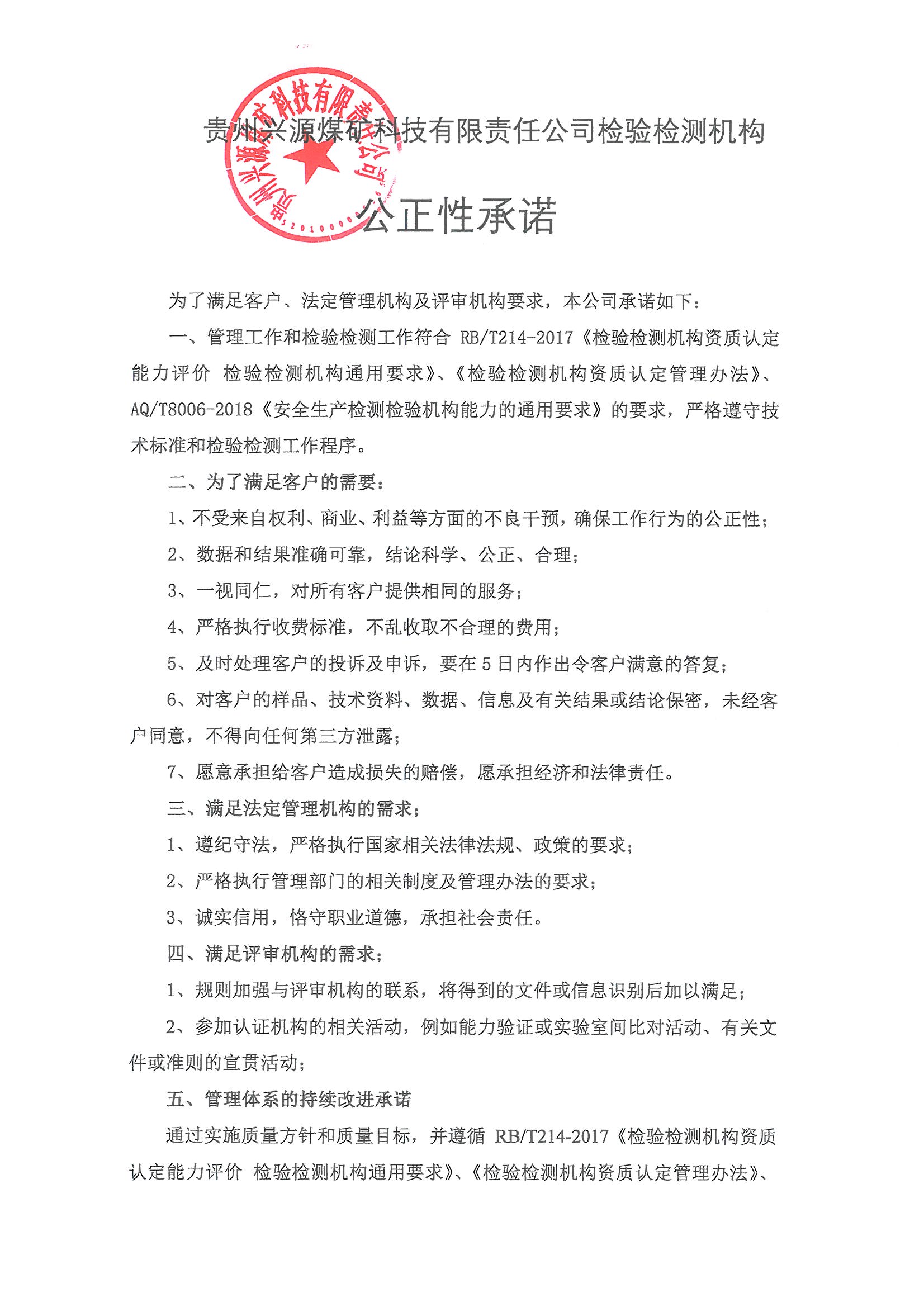 貴州興源煤礦科技有限責任公司檢驗檢測機構 公正性承諾