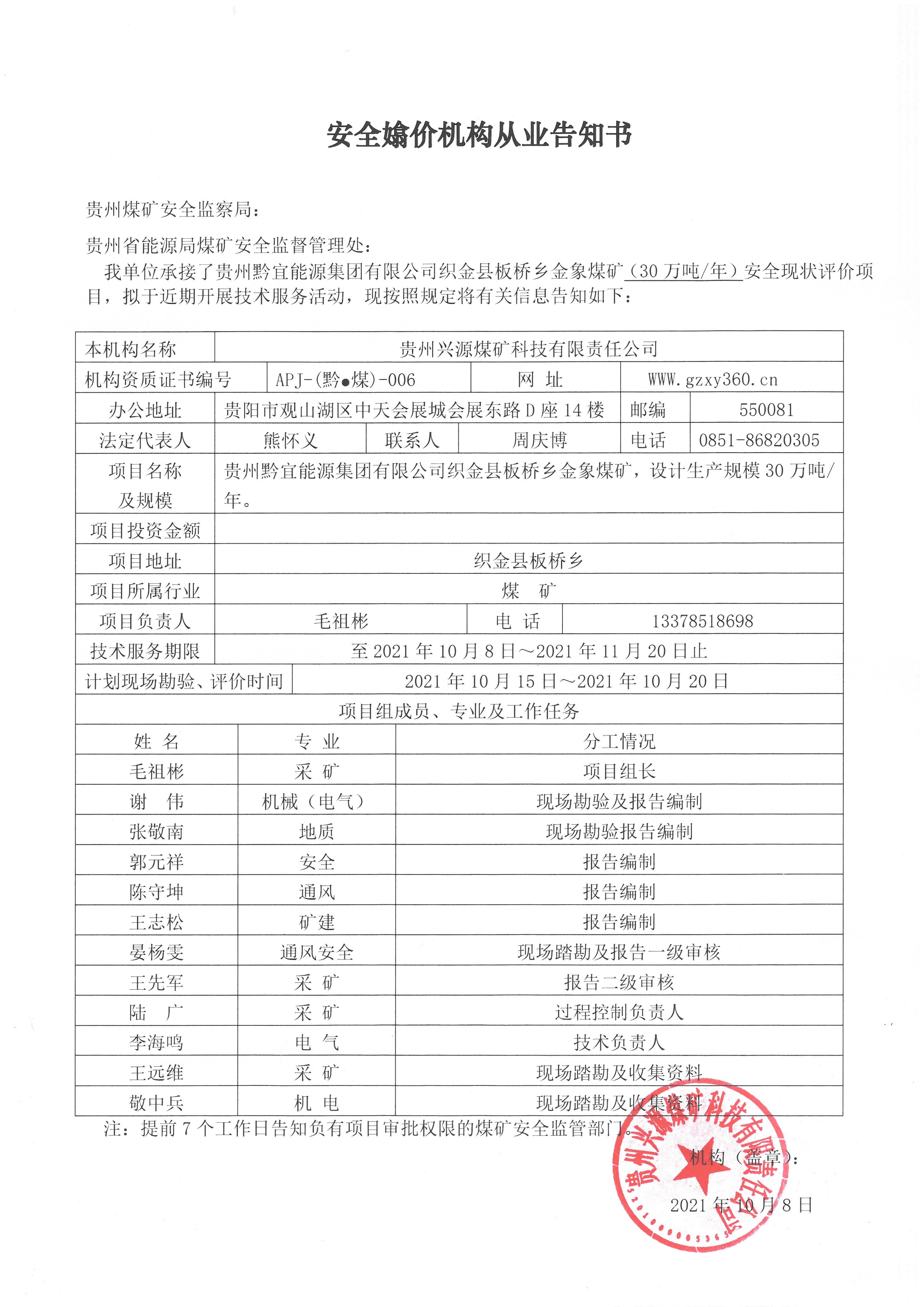 安全評價機構從業告知書(貴州黔宜能源集團有限公司織金縣板橋鄉金象煤礦(30萬噸/年)安全現狀評價)
