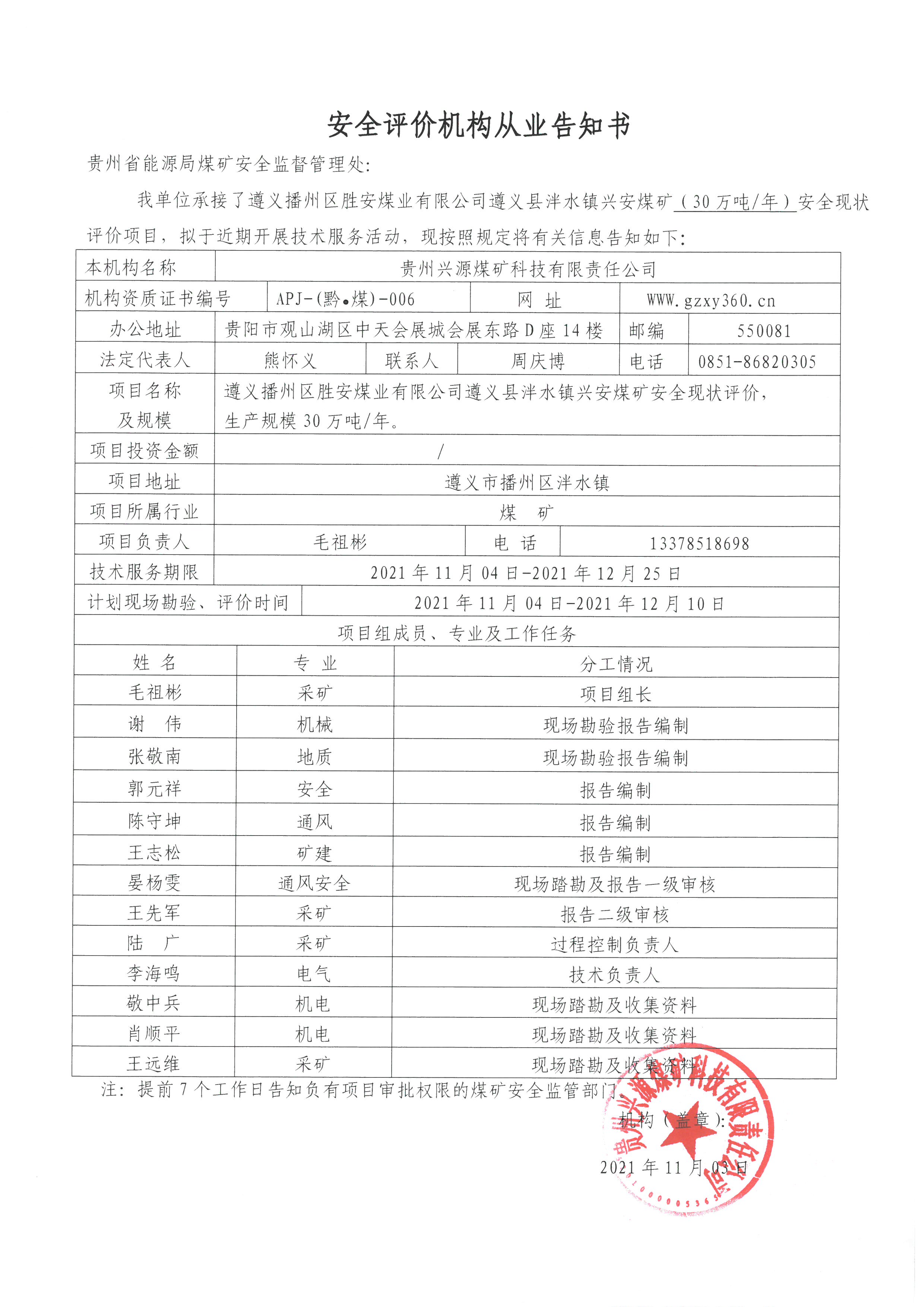 安全評價機構從業告知書(遵義播州區勝安煤業有限公司遵義縣泮水鎮興安煤礦(30萬噸/年)安全現狀評價)