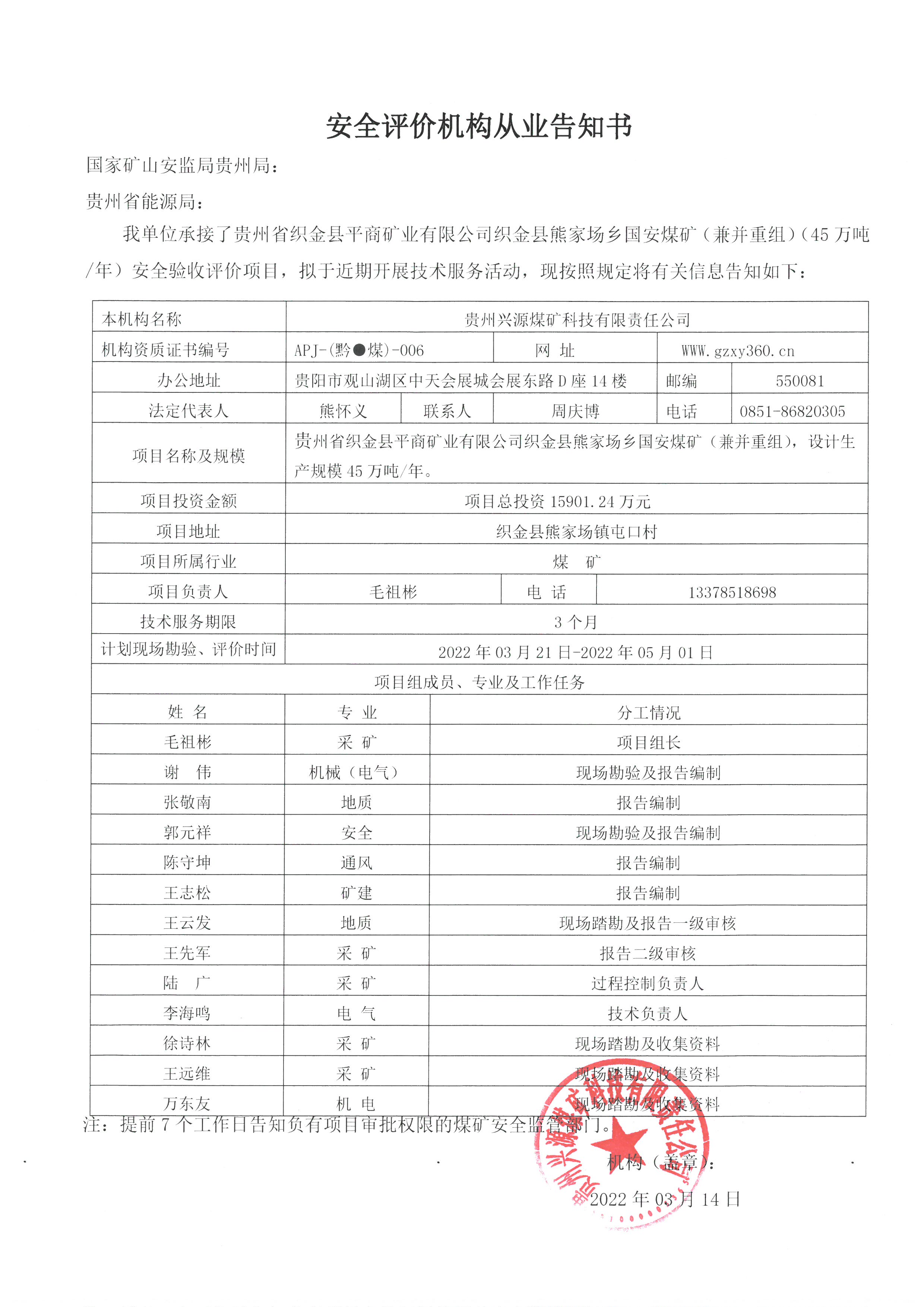 安全評價機構從業告知書【貴州省織金縣平商礦業有限公司織金縣熊家場鄉國安煤礦(兼并重組)(45萬噸/年)安全驗收評價】