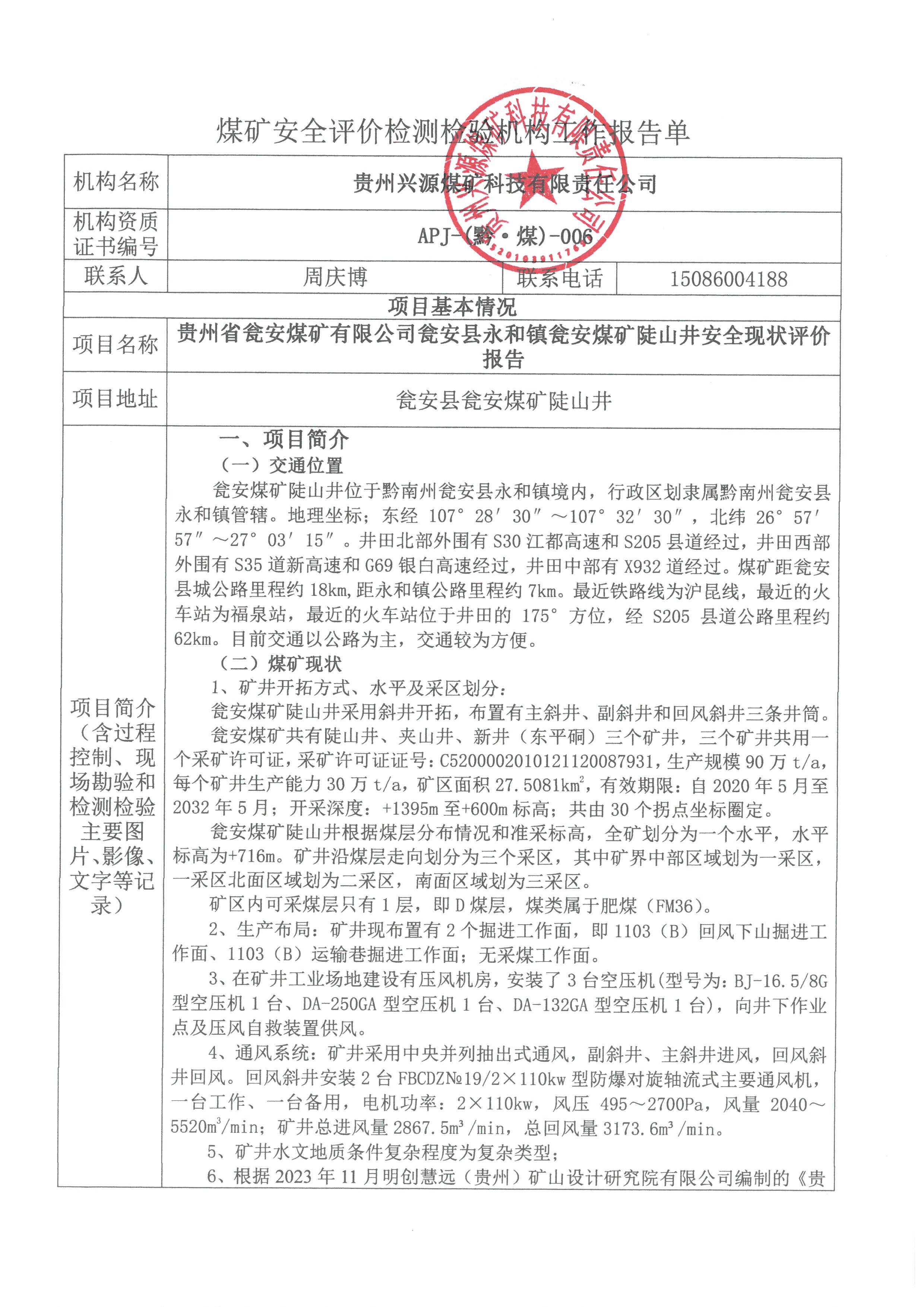 煤礦安全評價檢測檢驗機構工作報告單(貴州省甕安煤礦有限公司甕安縣永和鎮甕安煤礦陡山井安全現狀評價報告)