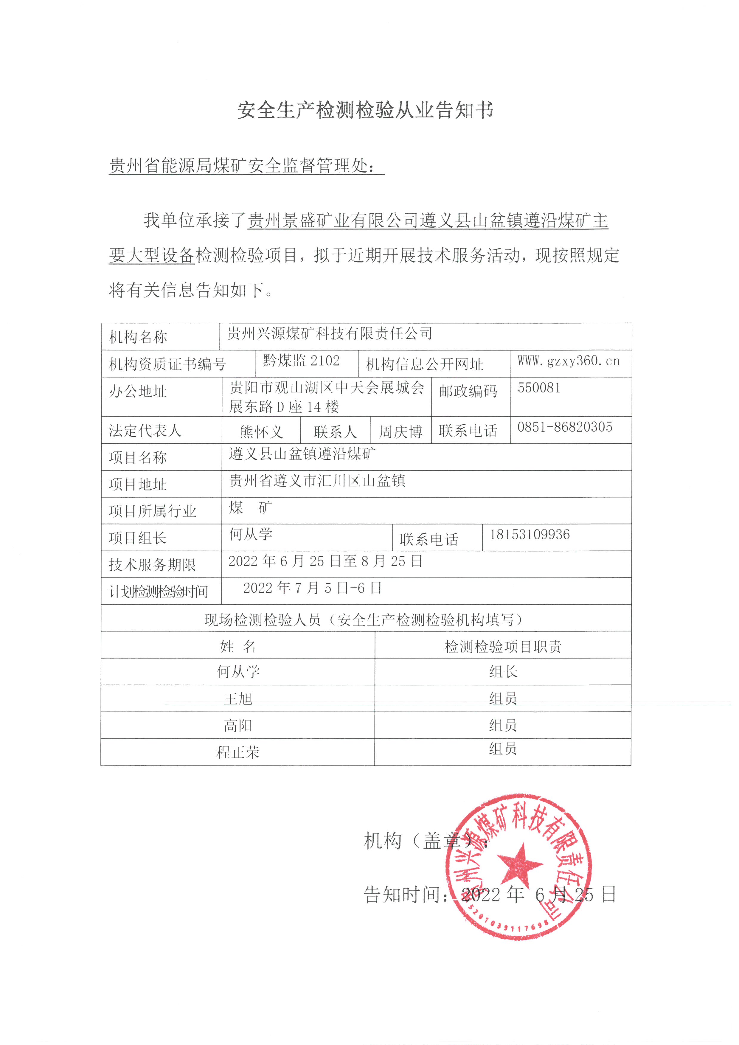 安全生產(chǎn)檢測檢驗從業(yè)告知書【貴州景盛礦業(yè)有限公司遵義縣山盆鎮(zhèn)遵沿煤礦主要大型設備檢測檢驗項目】
