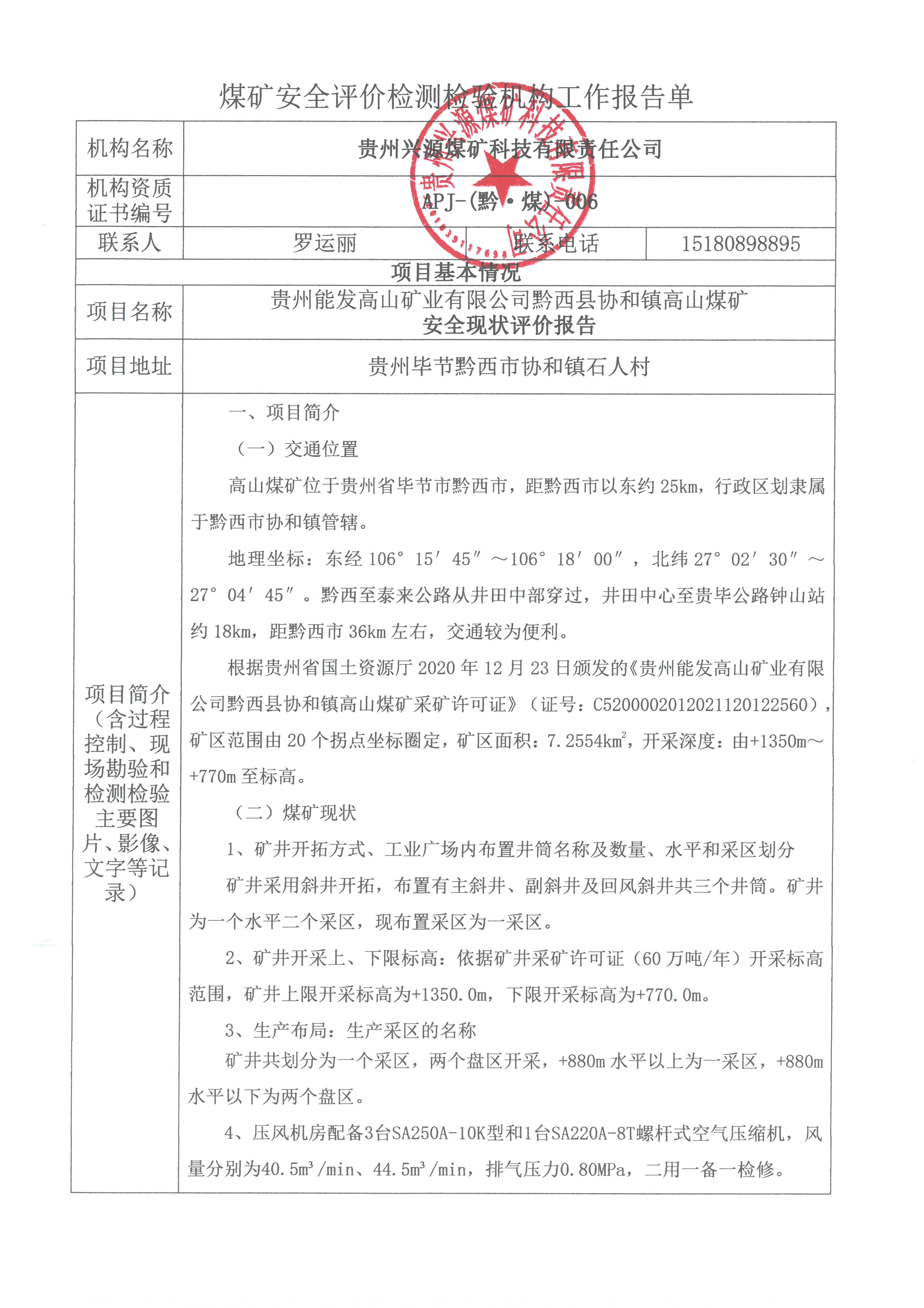 貴州能發(fā)高山礦業(yè)有限公司黔西縣協(xié)和鎮(zhèn)高山煤礦 安全現(xiàn)狀評價報告