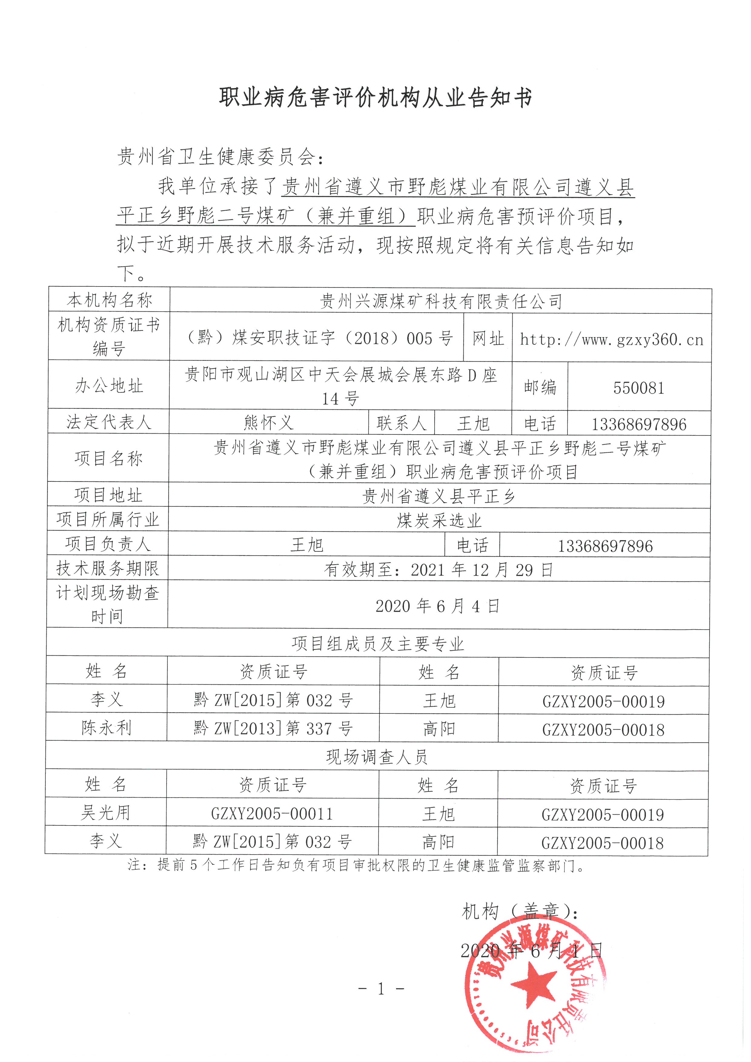 職業(yè)病危害評(píng)價(jià)機(jī)構(gòu)從業(yè)告知書【貴州省遵義市野彪煤業(yè)有限公司遵義縣平正鄉(xiāng)野彪二號(hào)煤礦(兼并重組)】