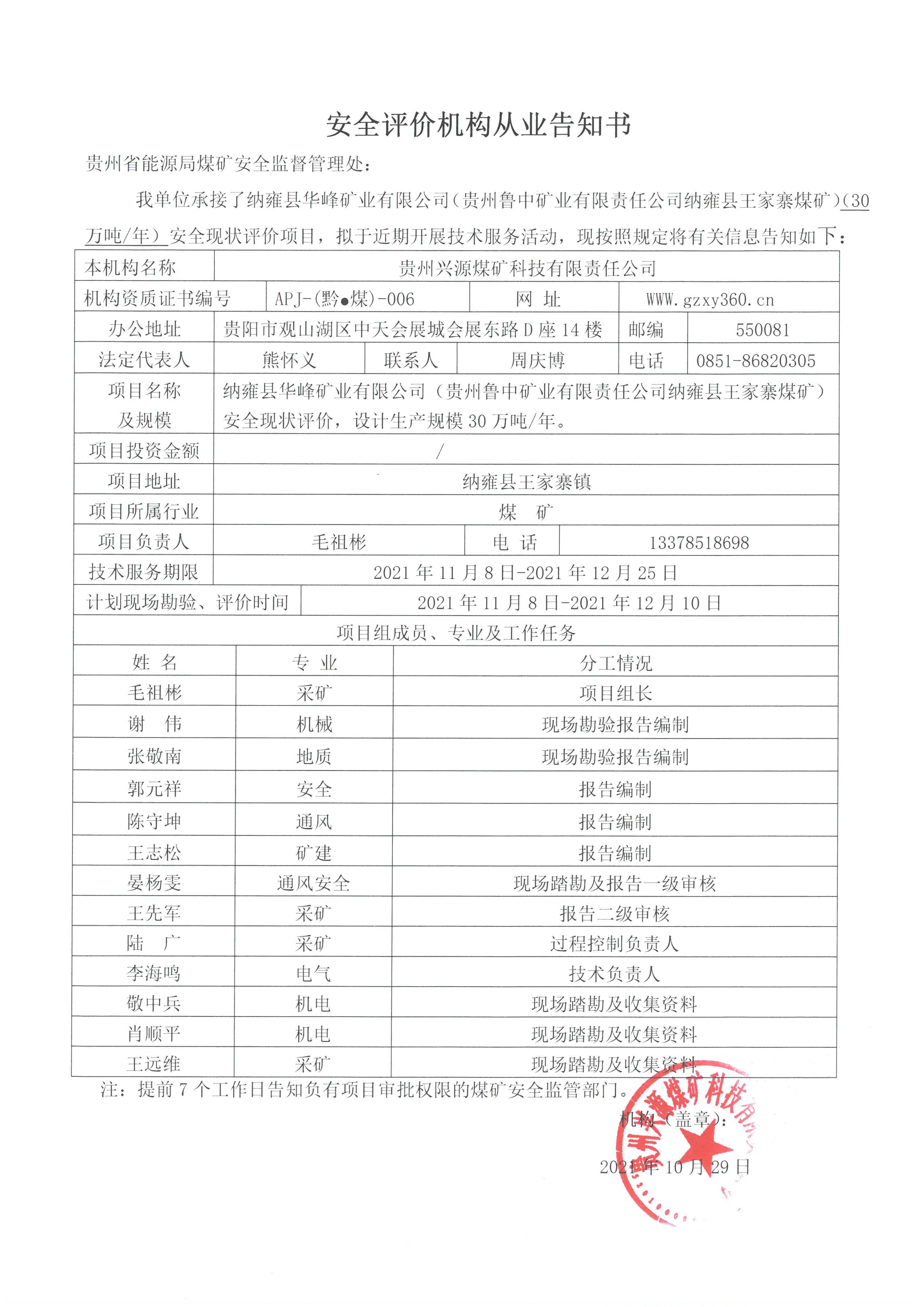 安全評(píng)價(jià)機(jī)構(gòu)從業(yè)告知書(納雍縣華峰礦業(yè)有限公司(貴州魯中礦業(yè)有限責(zé)任公司納雍縣王家寨煤礦)(30萬噸年)安全現(xiàn)狀評(píng)價(jià))