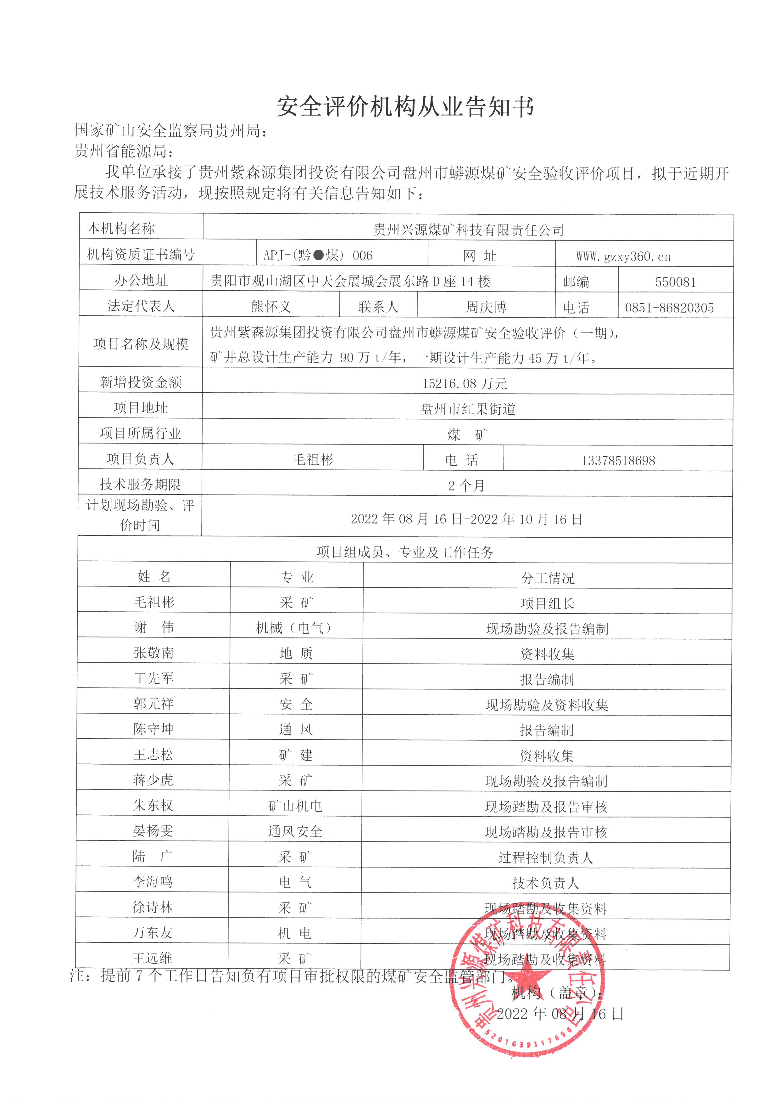 安全評(píng)價(jià)機(jī)構(gòu)從業(yè)告知書【貴州紫森源集團(tuán)投資有限公司盤州市蟒源煤礦】