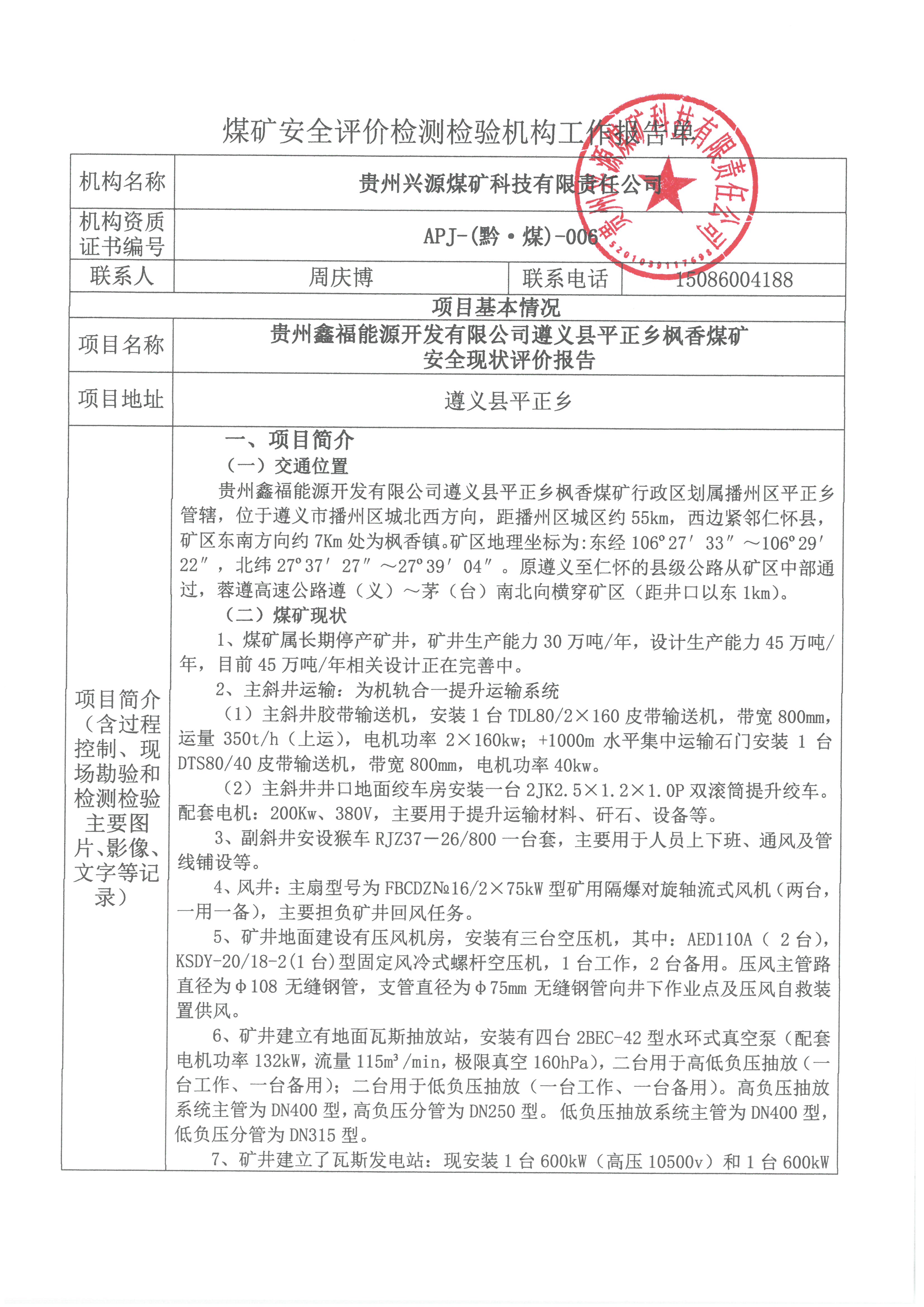 煤礦安全評(píng)價(jià)檢測(cè)檢驗(yàn)機(jī)構(gòu)工作報(bào)告單【貴州鑫福能源開發(fā)有限公司遵義縣平正鄉(xiāng)楓香煤礦】安全現(xiàn)狀評(píng)價(jià)報(bào)告