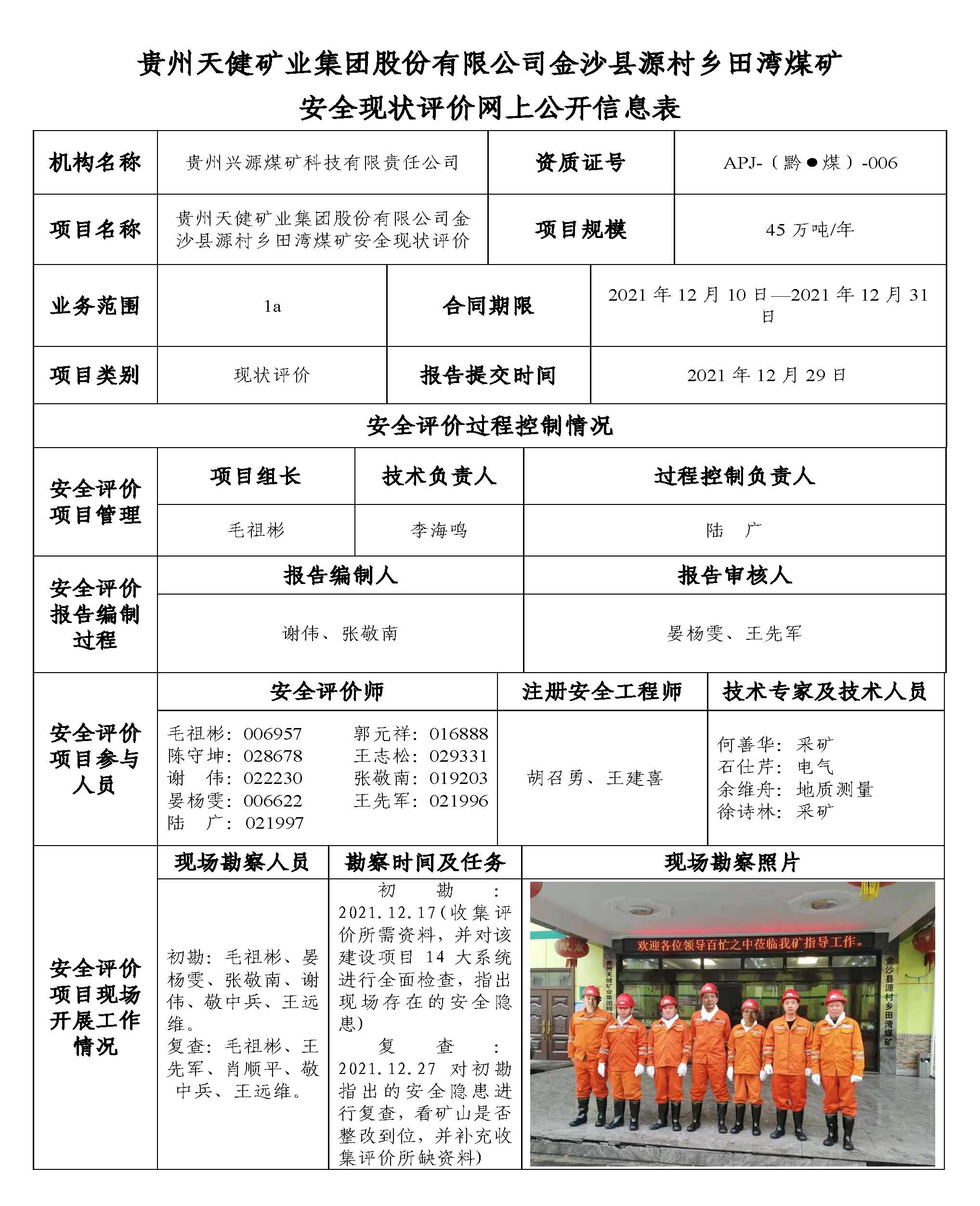 貴州天健礦業集團股份有限公司金沙縣源村鄉田灣煤礦安全現狀評價網上公開信息表
