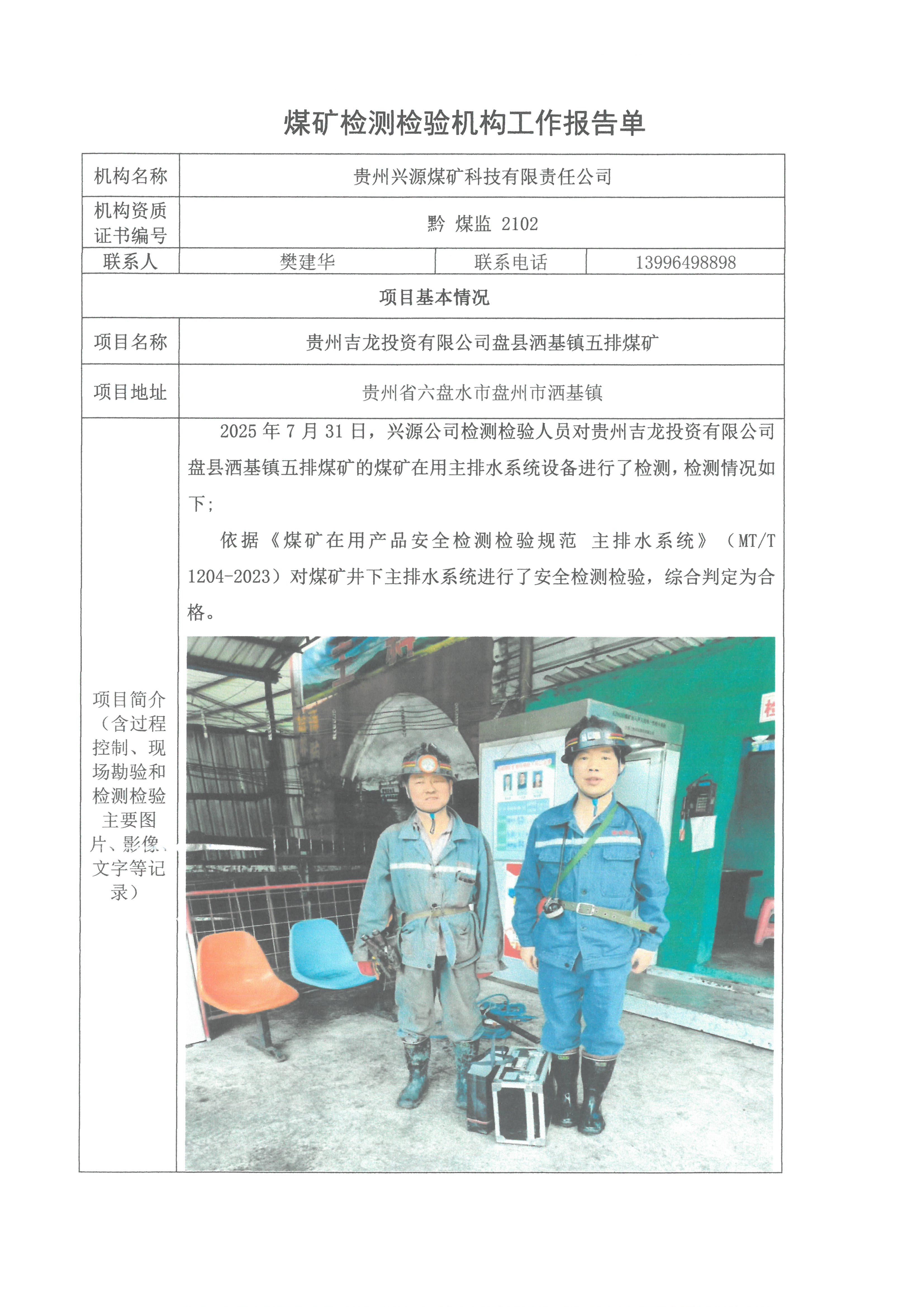 煤礦檢測檢驗機構工作報告單【貴州吉龍投資有限公司盤縣灑基鎮五排煤礦】