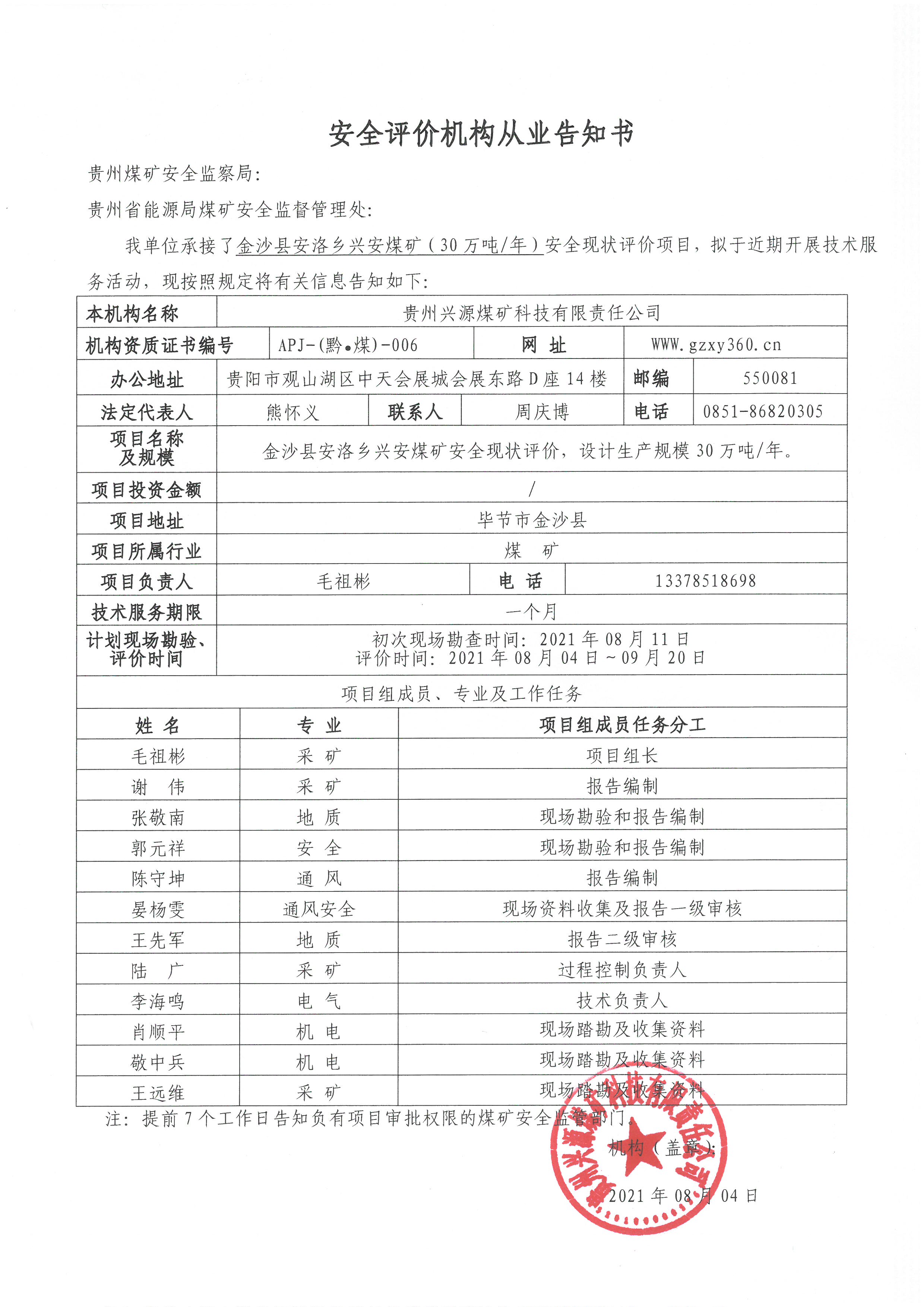 安全評價機構從業告知書(金沙縣安洛鄉興安煤礦(30萬噸年)安全現狀評價)