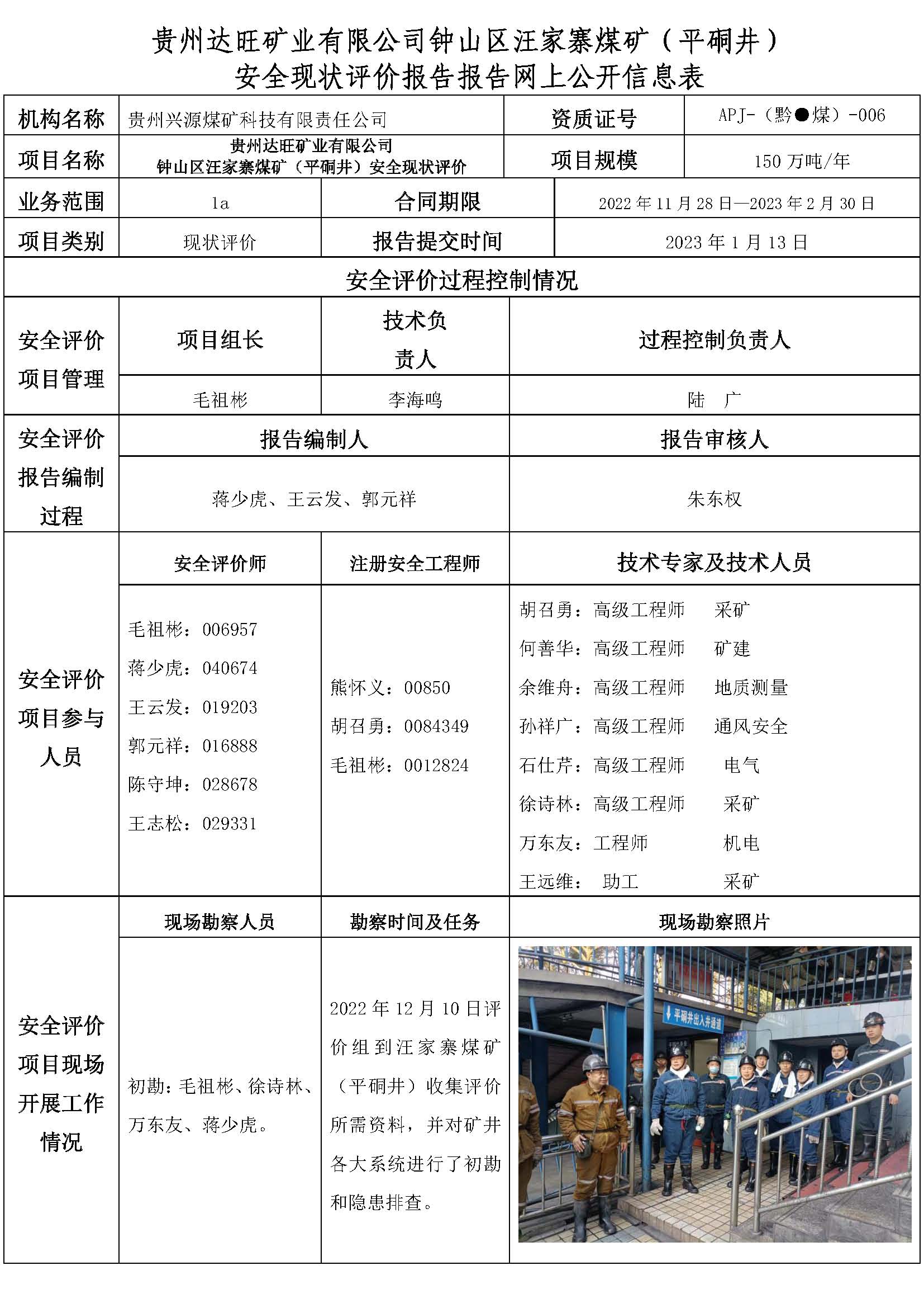 貴州達旺礦業有限公司鐘山區汪家寨煤礦(平硐井) 安全現狀評價報告報告網上公開信息表