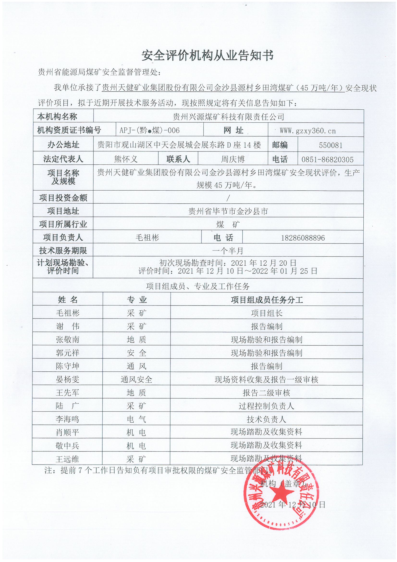 安全評價機構從業告知書(貴州天健礦業集團股份有限公司金沙縣源村鄉田灣煤礦(45萬噸/年)安全現狀評價)