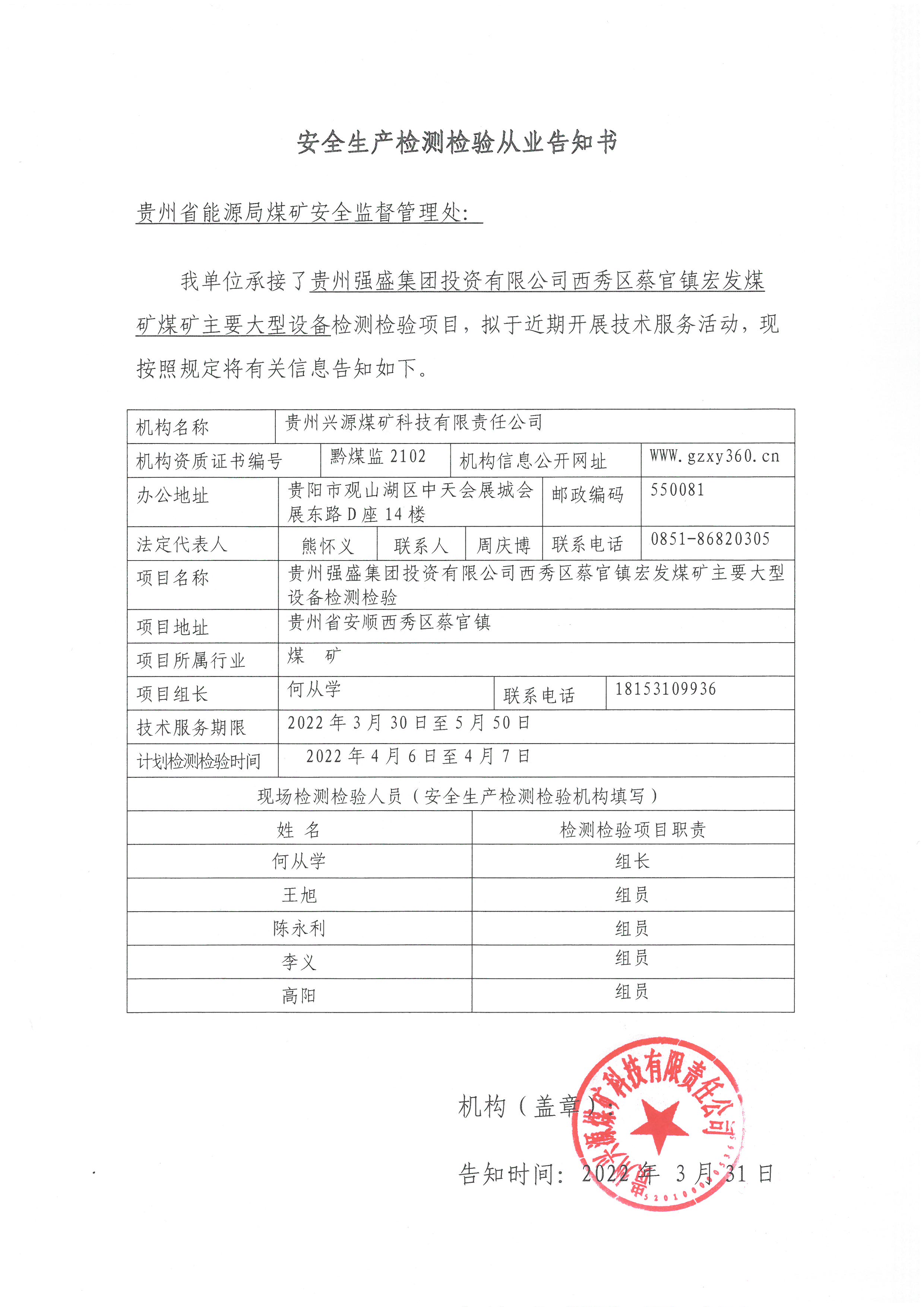 安全生產檢測檢驗從業告知書【貴州強盛集團投資有限公司西秀區蔡官鎮宏發煤礦】