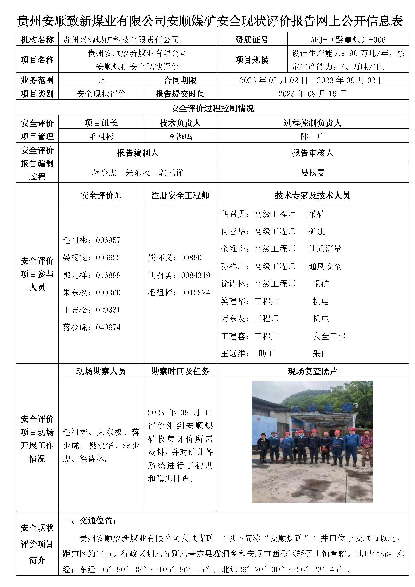 貴州安順致新煤業有限公司安順煤礦安全現狀評價報告網上公開信息表