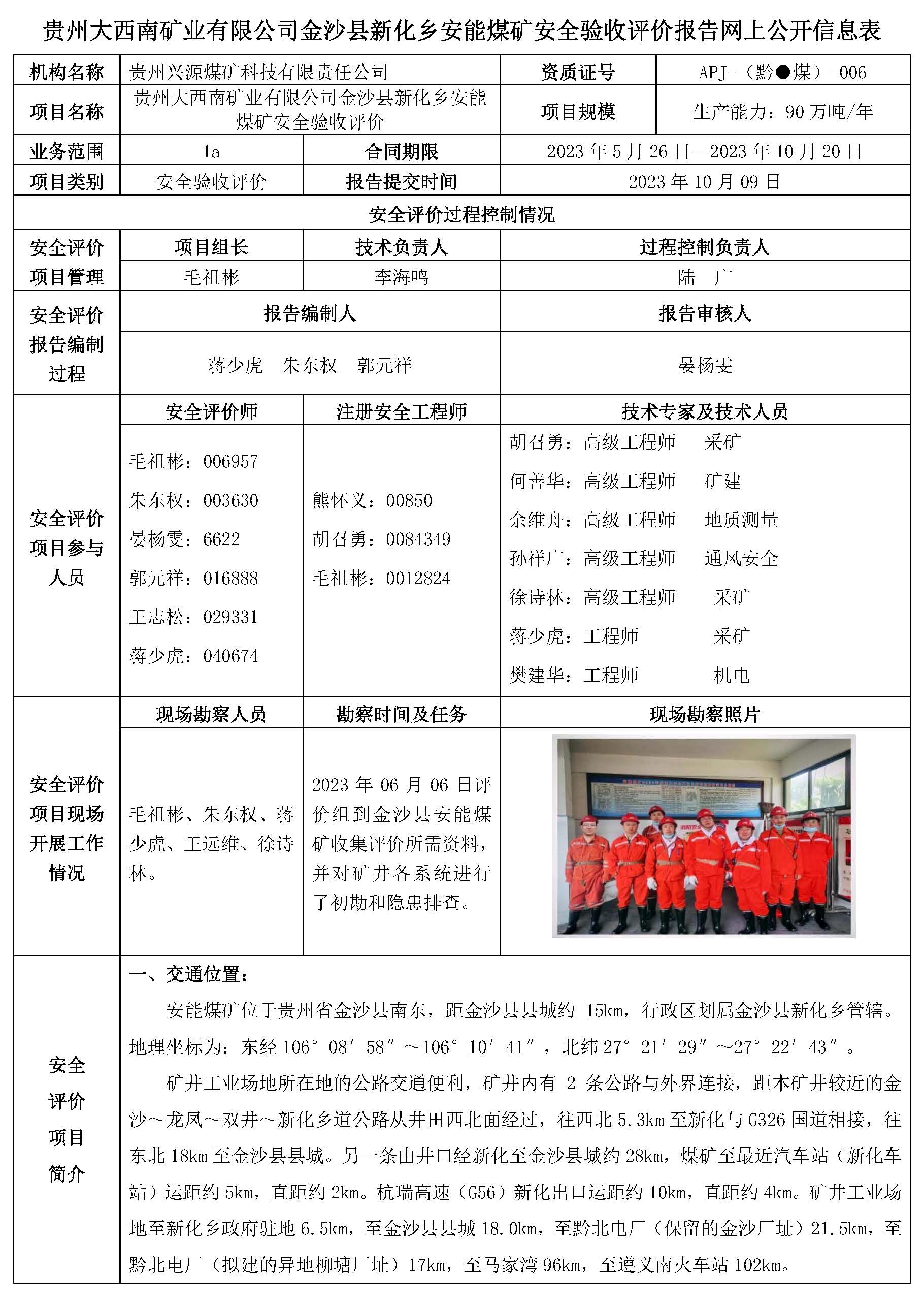 貴州大西南礦業有限公司金沙縣新化鄉安能煤礦安全驗收評價報告網上公開信息表
