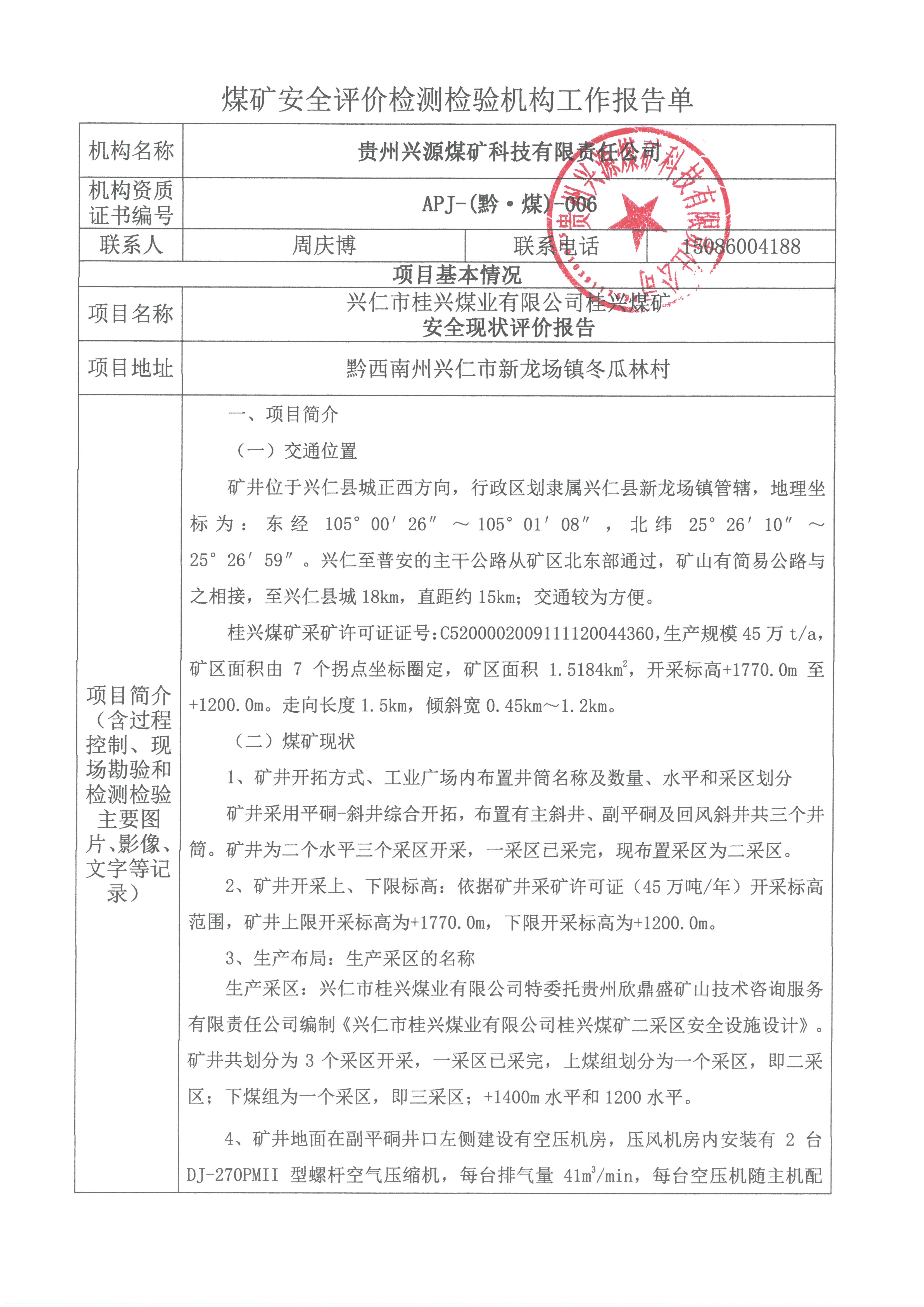 煤礦安全評價檢測檢驗機構工作報告單【興仁市桂興煤業有限公司桂興煤礦安全現狀評價報告】