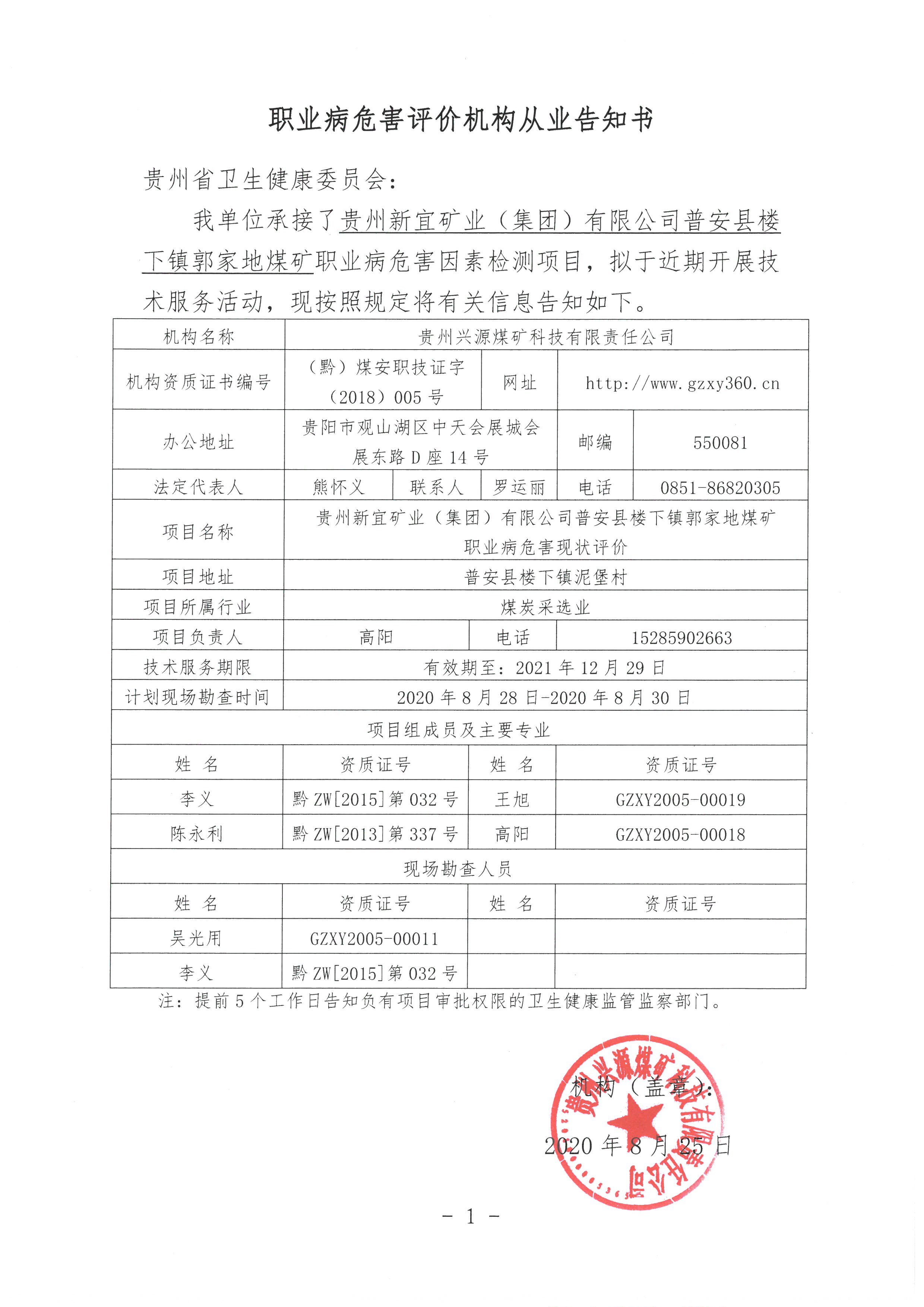 職業病危害評價機構從業告知書【貴州新宜礦業(集團)有限公司普安縣樓下鎮郭家地煤礦】