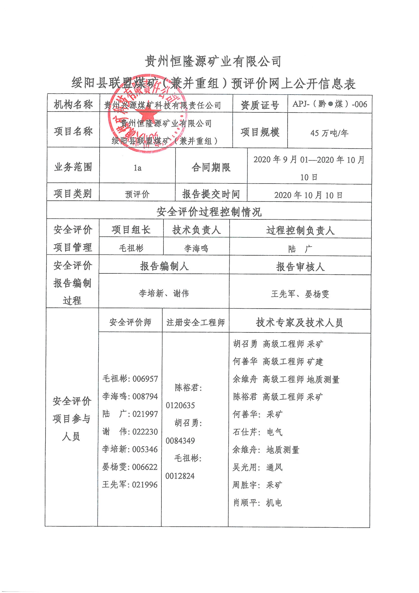 貴州恒隆源礦業有限公司綏陽縣聯盟煤礦兼并重組(45萬噸/年)安全預評價網上公開信息表