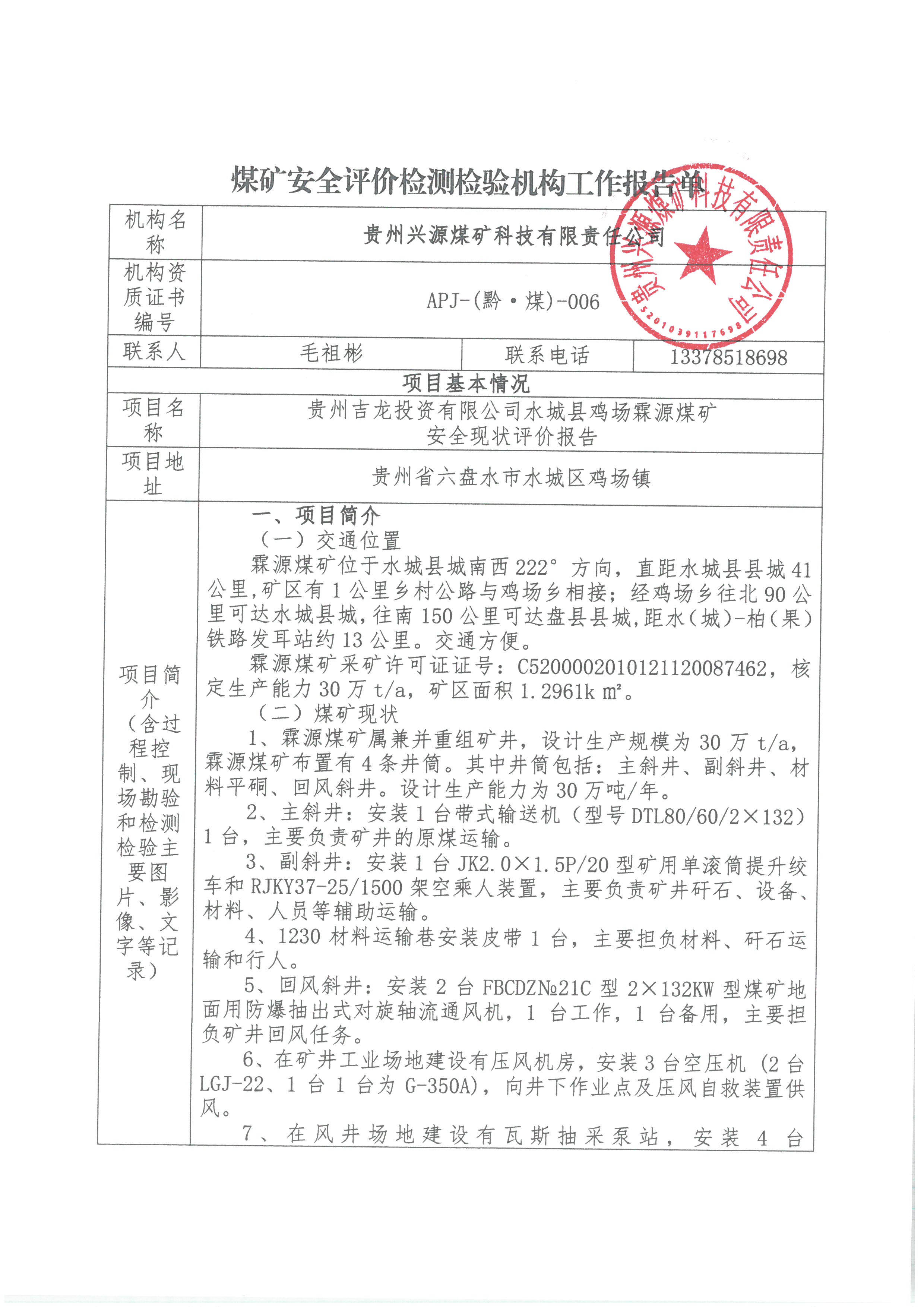 煤礦安全評價檢測檢驗機構工作報告單【貴州吉龍投資有限公司水城縣雞場霖源煤礦安全現狀評價報告】