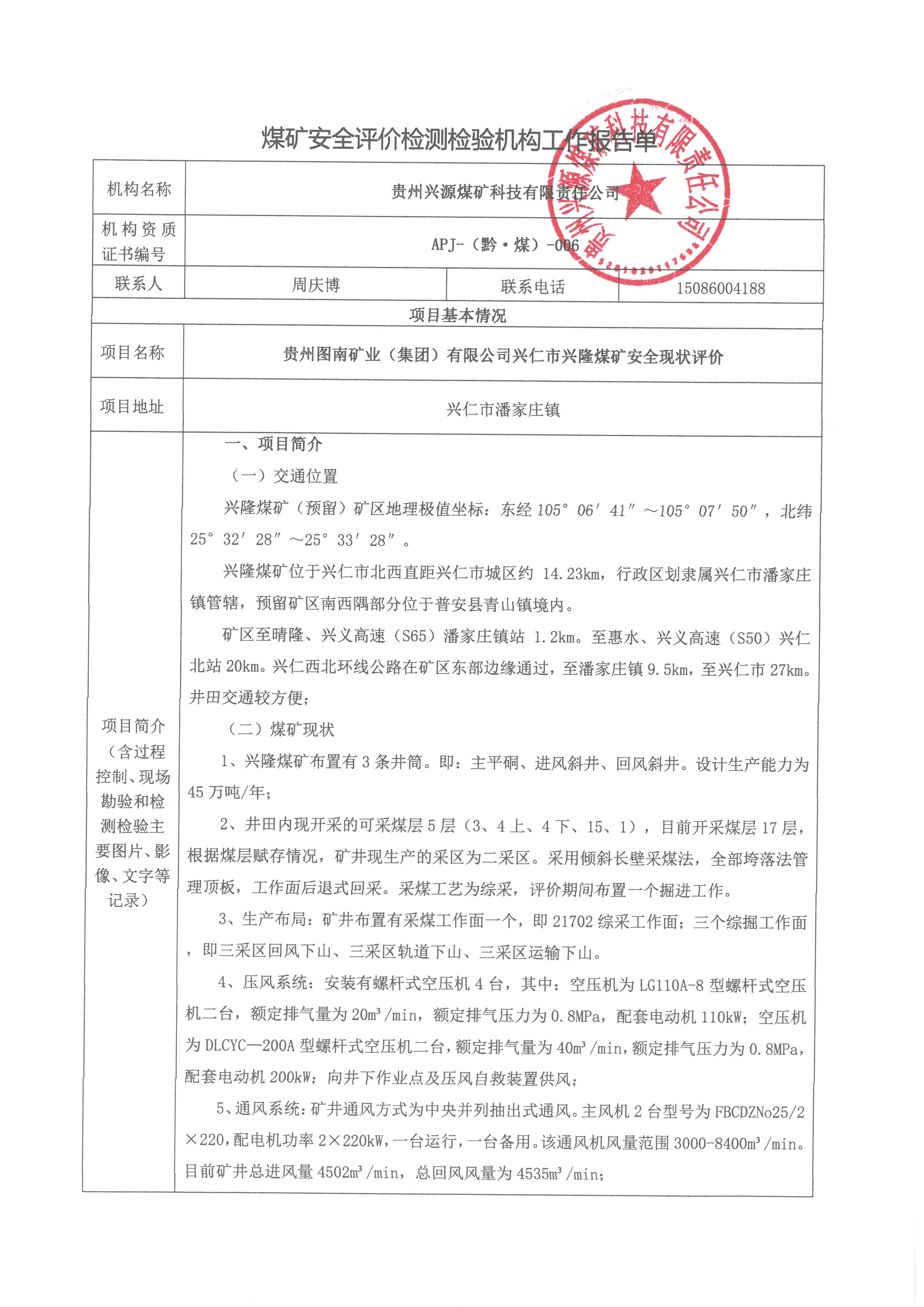 煤礦安全評價檢測檢驗機構工作報告單【貴州圖南礦業(集團)有限公司興仁市興隆煤礦安全現狀評價】