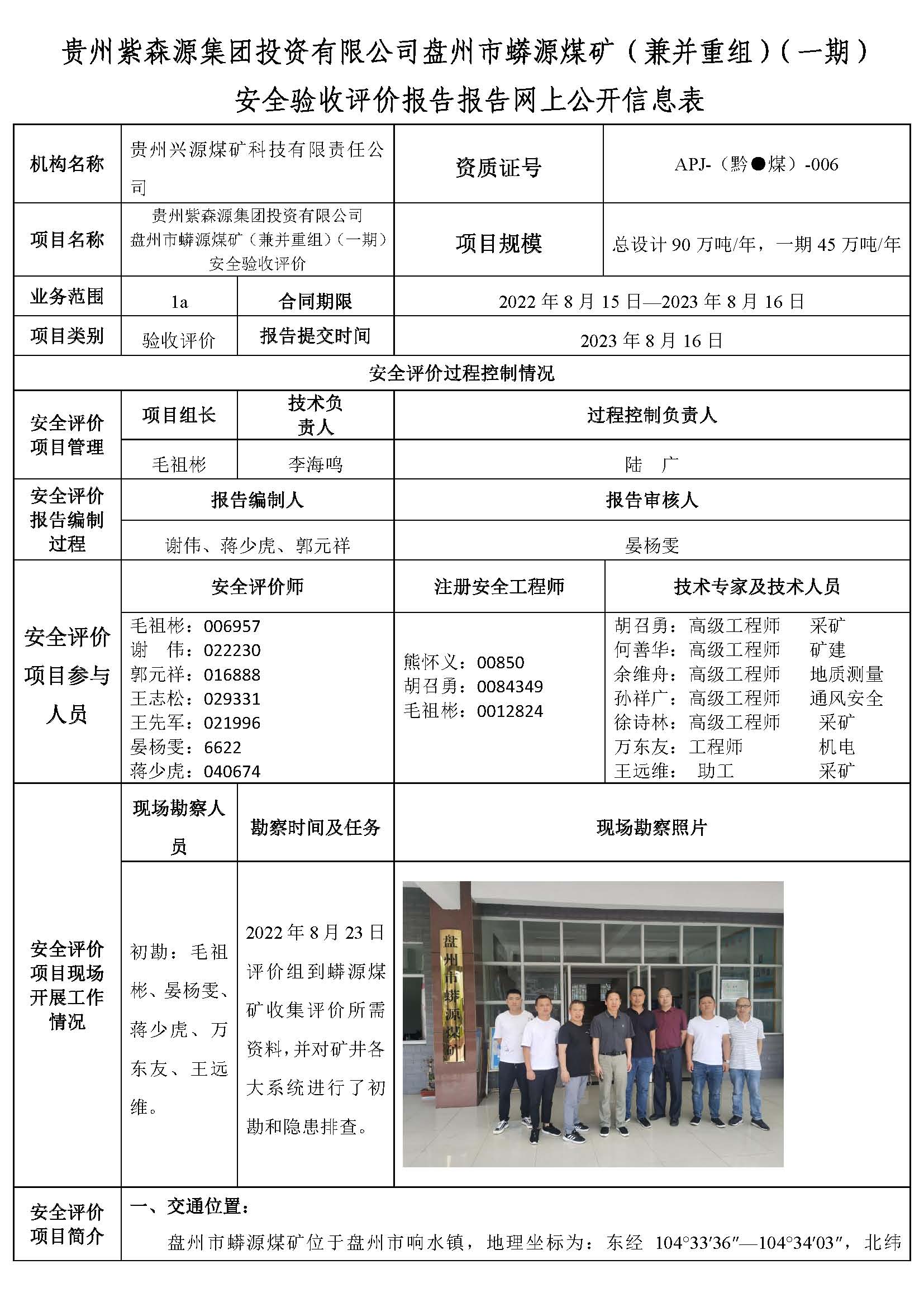 貴州紫森源集團投資有限公司盤州市蟒源煤礦(兼并重組)(一期) 安全驗收評價報告報告網上公開信息表