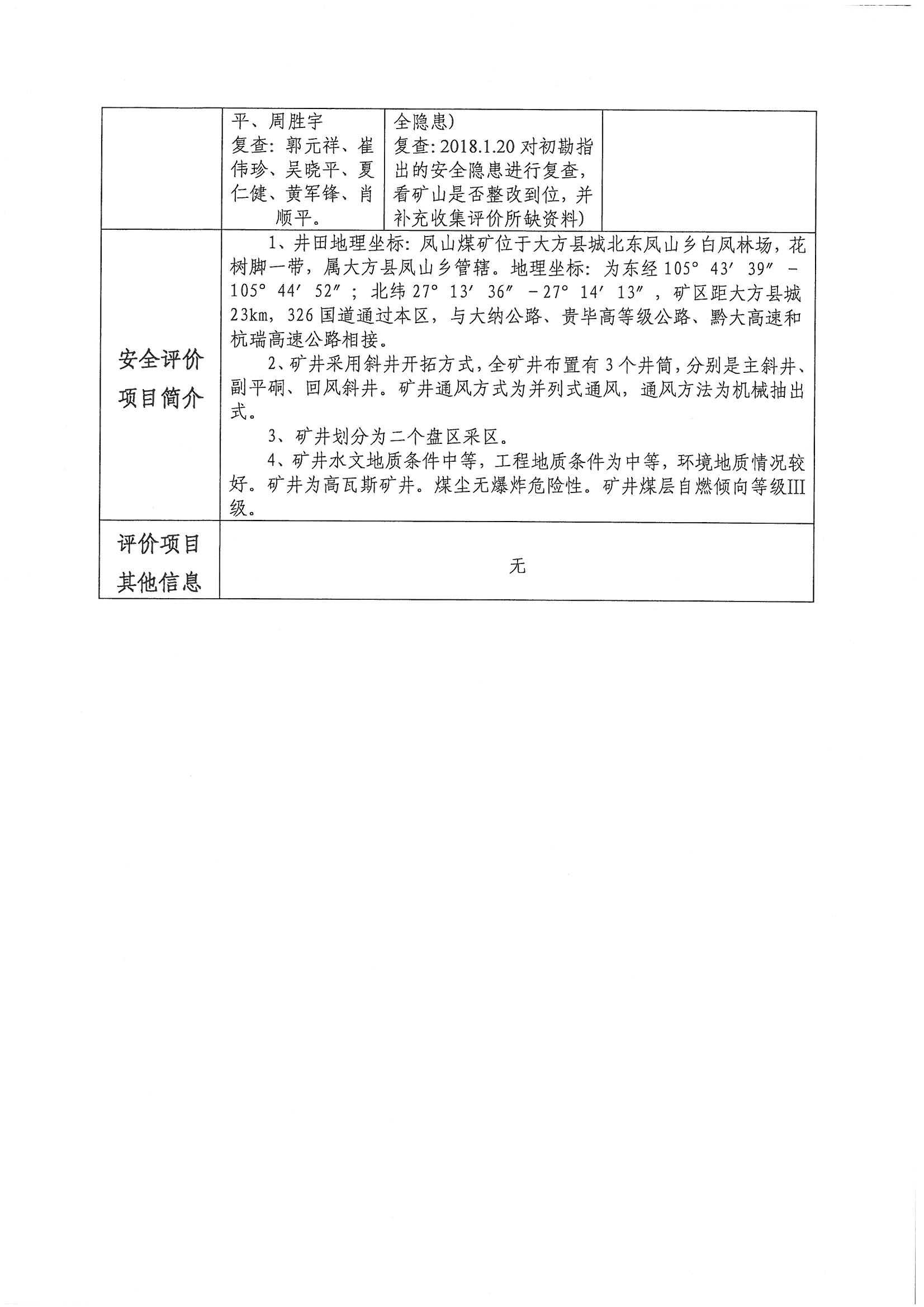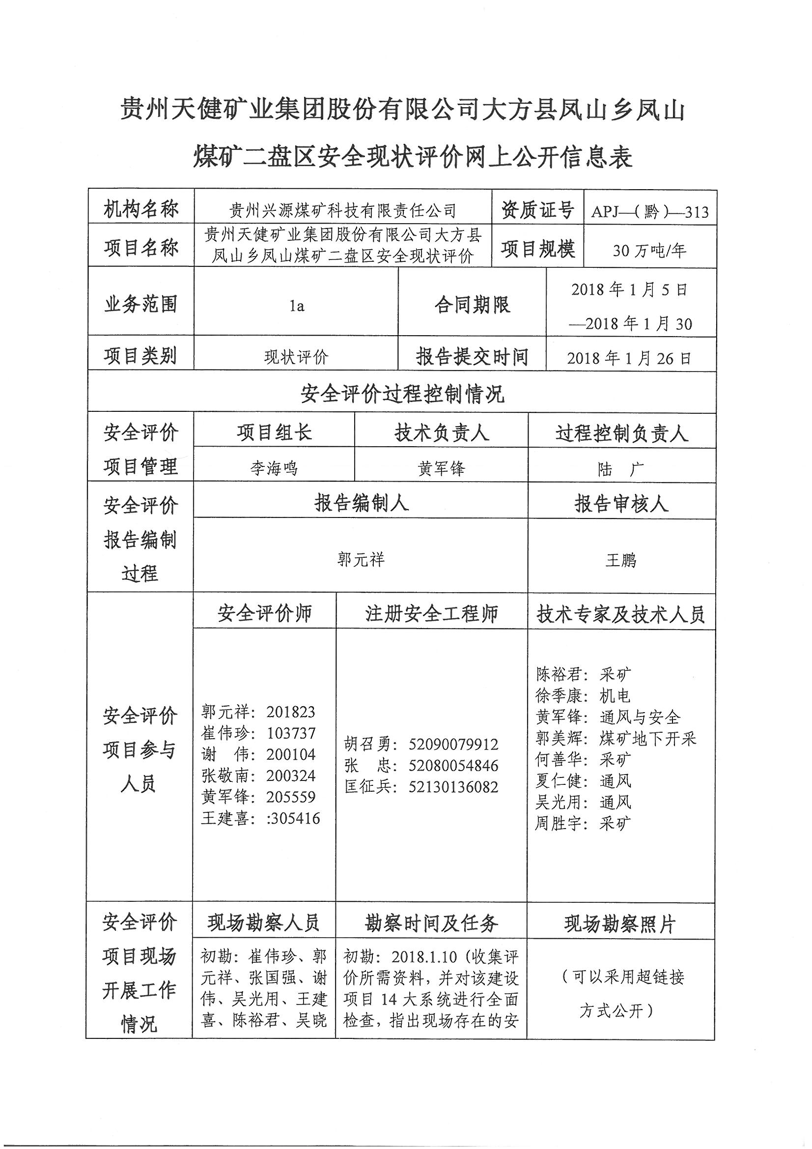 貴州天健礦業集團股份有限公司大方縣鳳山鄉鳳山煤礦二盤區安全現狀評價報告網上公開信息表