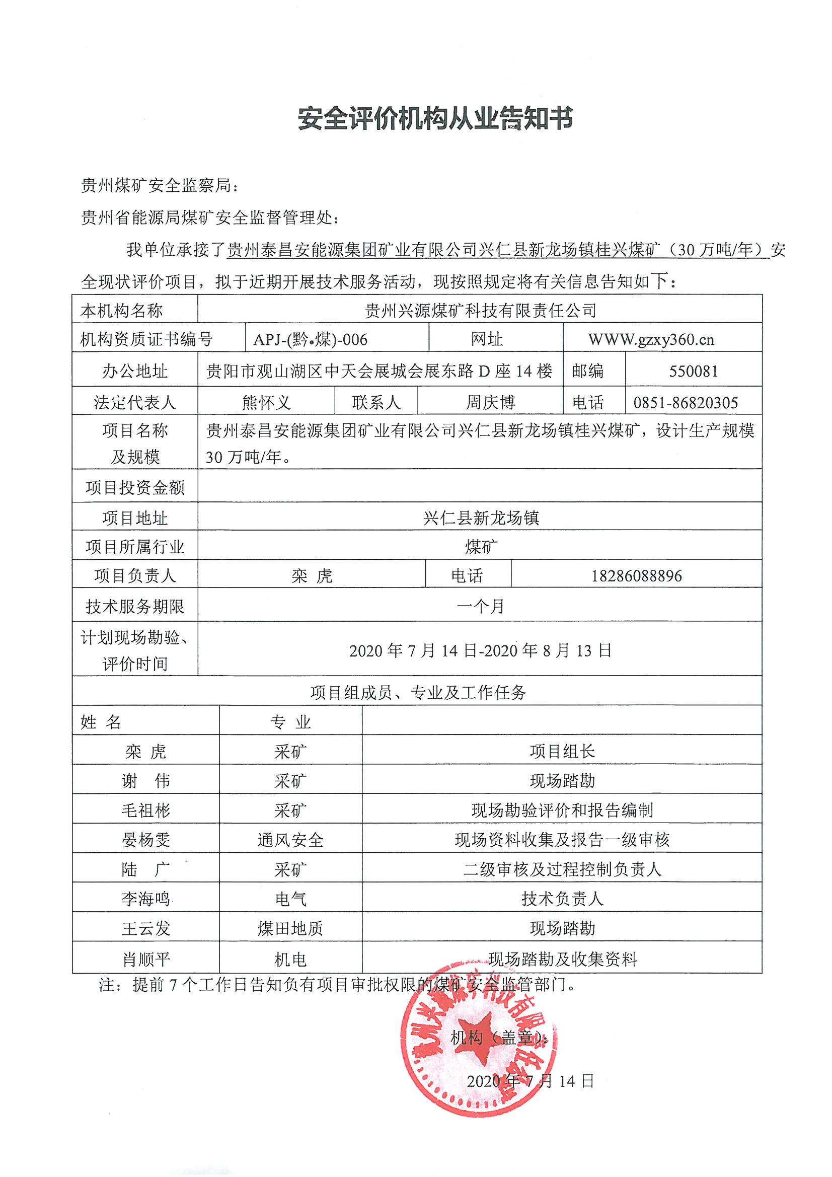 安全評價機構從業告知書(貴州泰昌安能源集團礦業有限公司興仁縣新龍場鎮桂興煤礦)