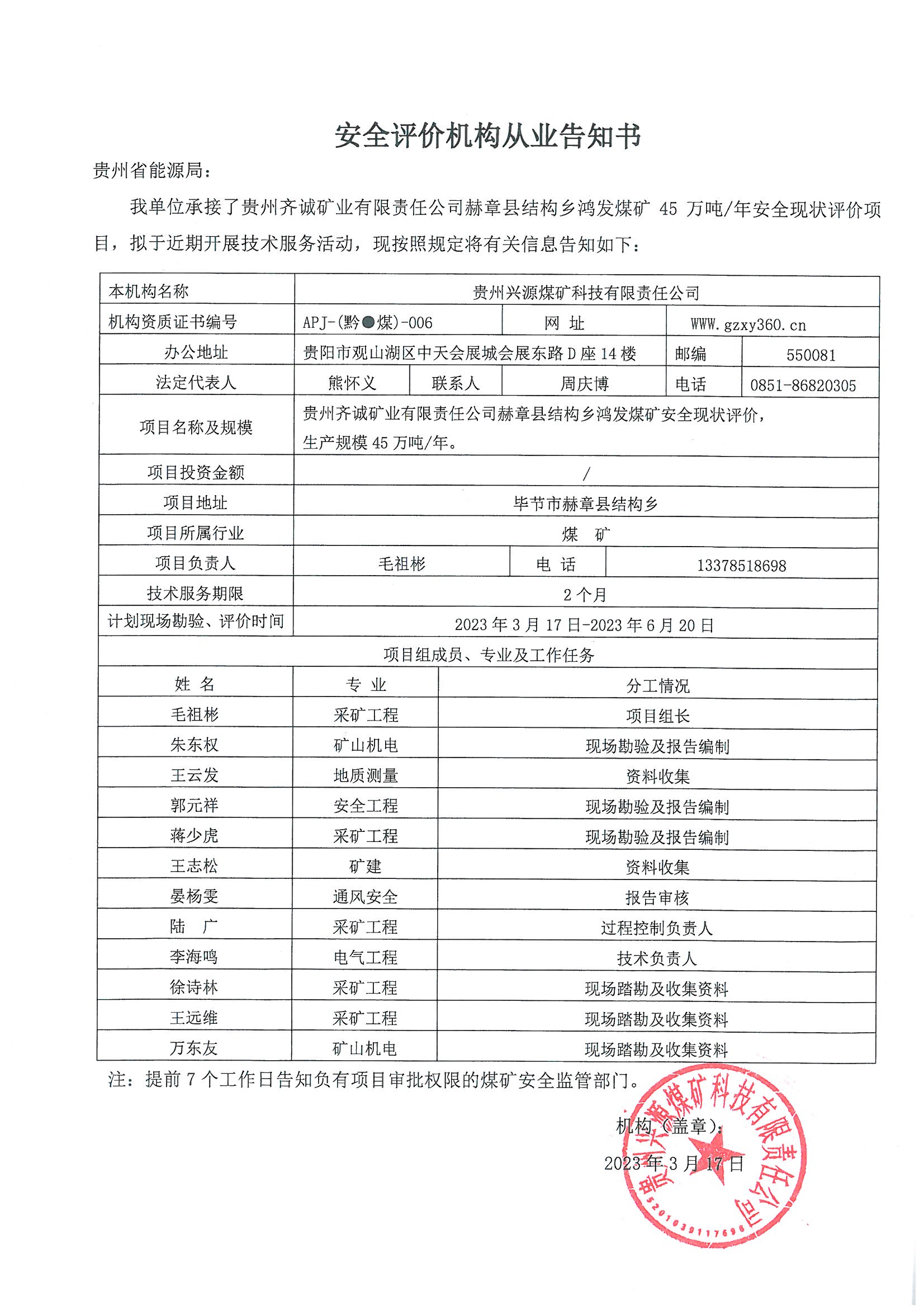安全評價機構從業告知書【貴州齊誠礦業有限責任公司赫章縣結構鄉鴻發煤礦】