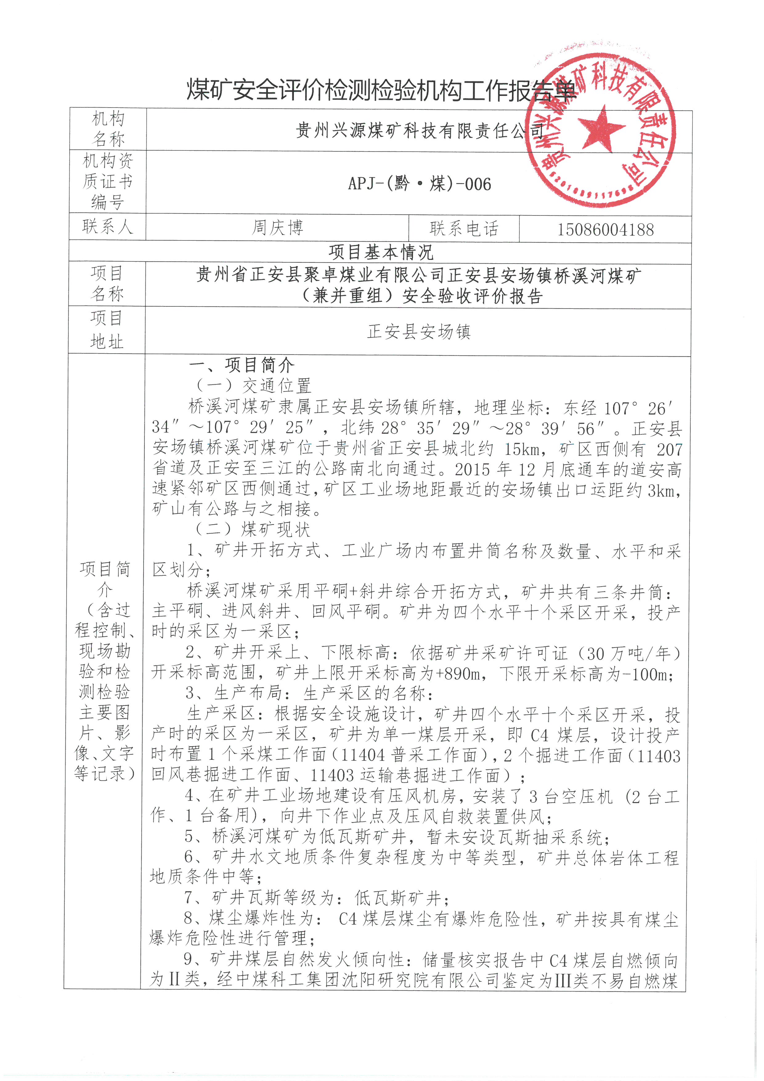煤礦安全評價檢測檢驗機構工作報告單【貴州省正安縣聚卓煤業有限公司正安縣安場鎮橋溪河煤礦 (兼并重組)安全驗收評價報告】